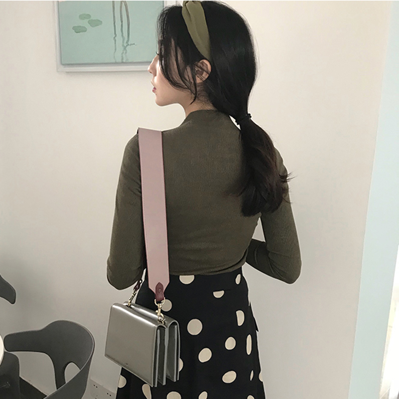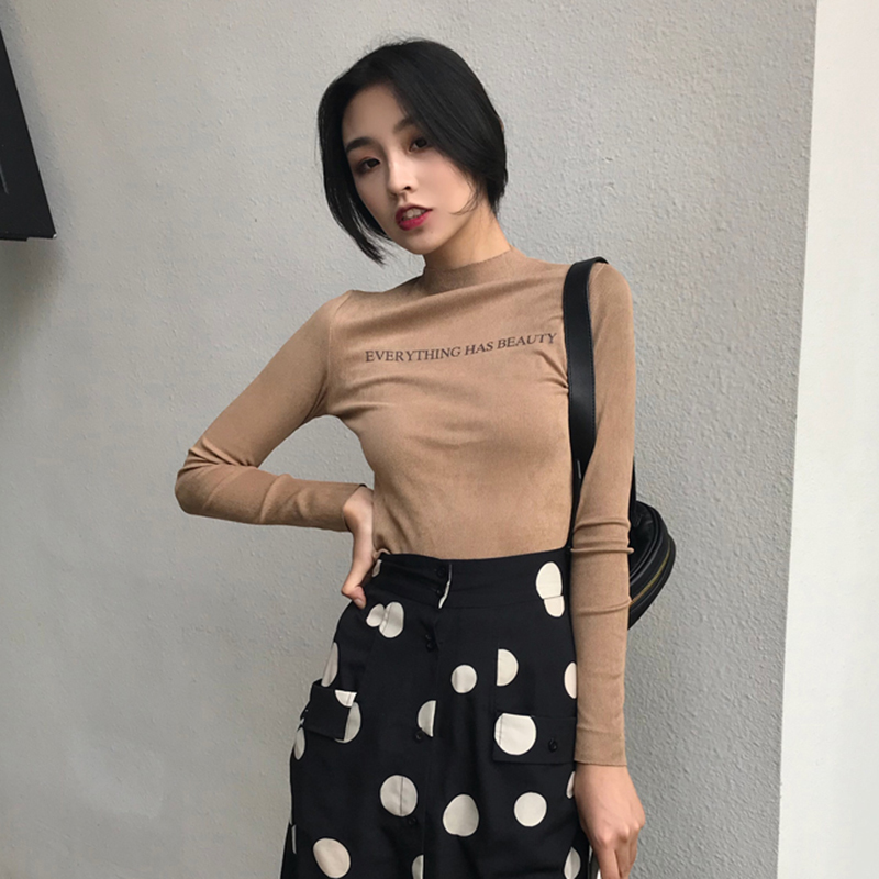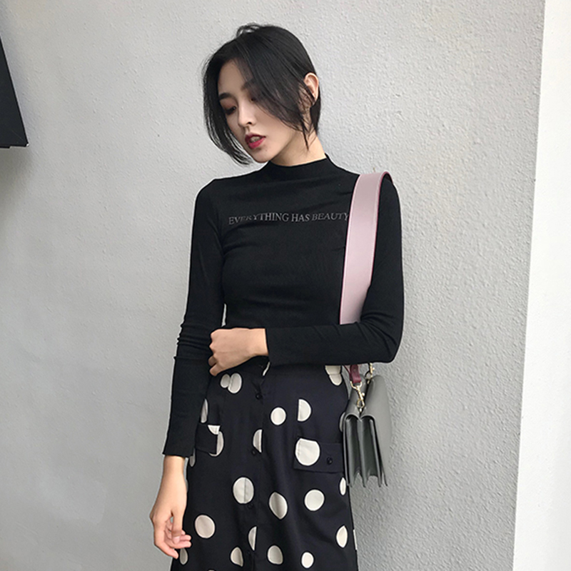 港味修身字母印花長袖T恤秋裝女2018新款時尚氣質半高領打底上衣