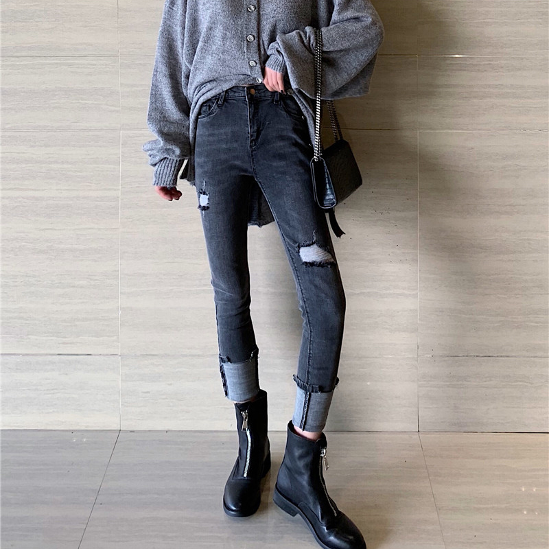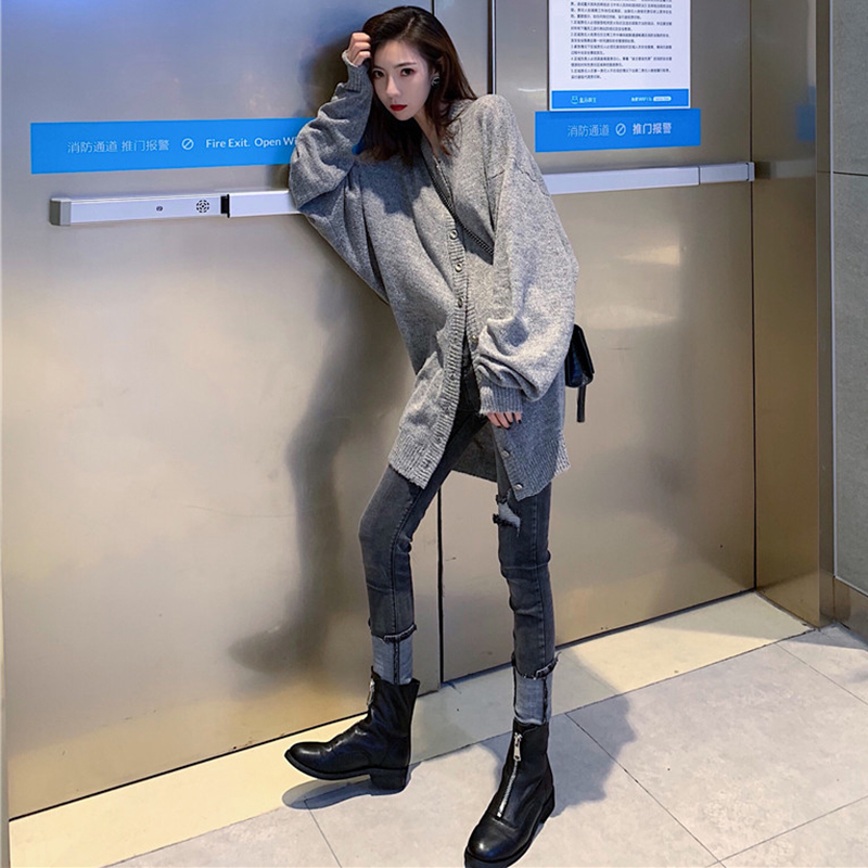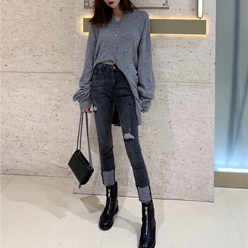 秋冬2018新款套裝女寬松長袖毛衣針織外套高腰顯瘦鉛筆牛仔長褲子