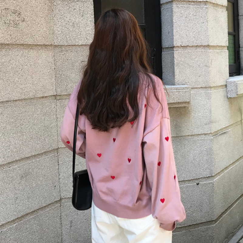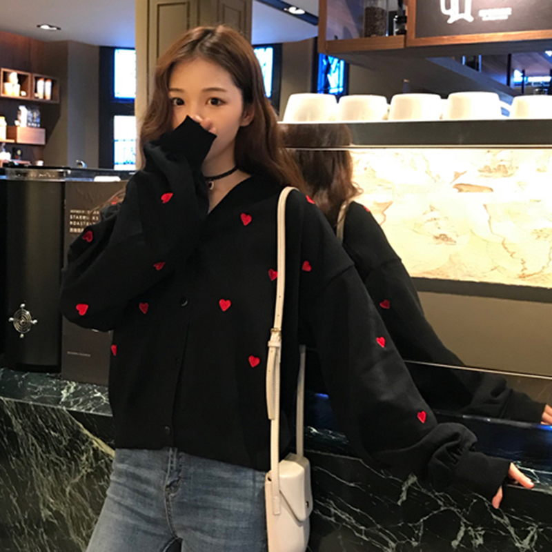 / 甜美少女愛心刺繡慵懶針織開衫秋裝新款學生寬松V領燈籠長袖上衣