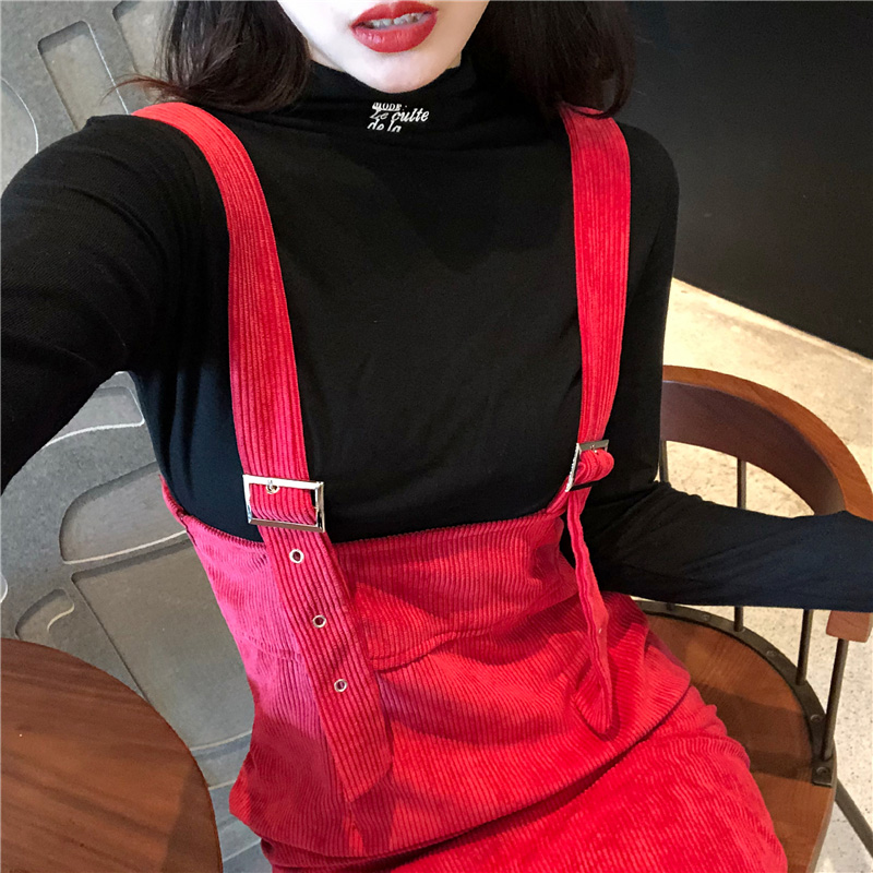 / 套裝女秋新款時尚字母針織T恤打底衫開叉黑色燈芯絨背帶連衣裙子