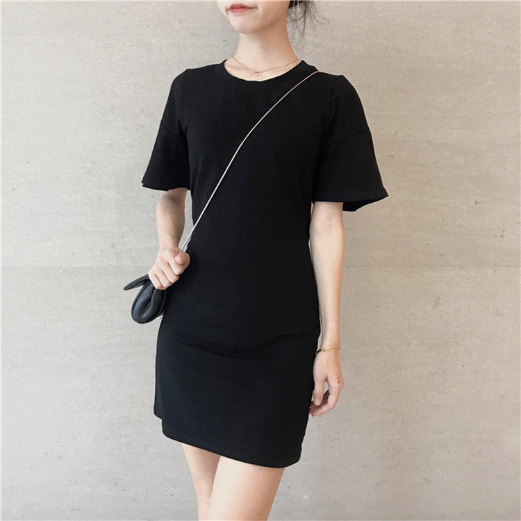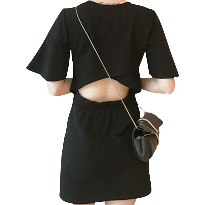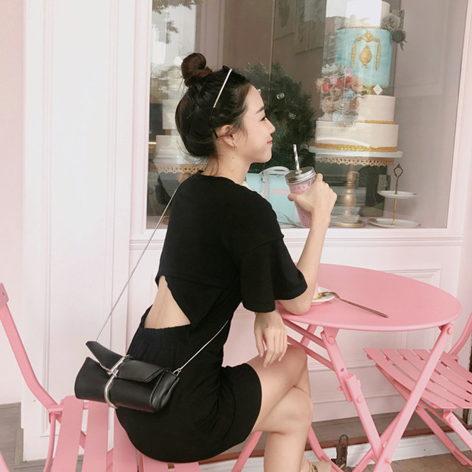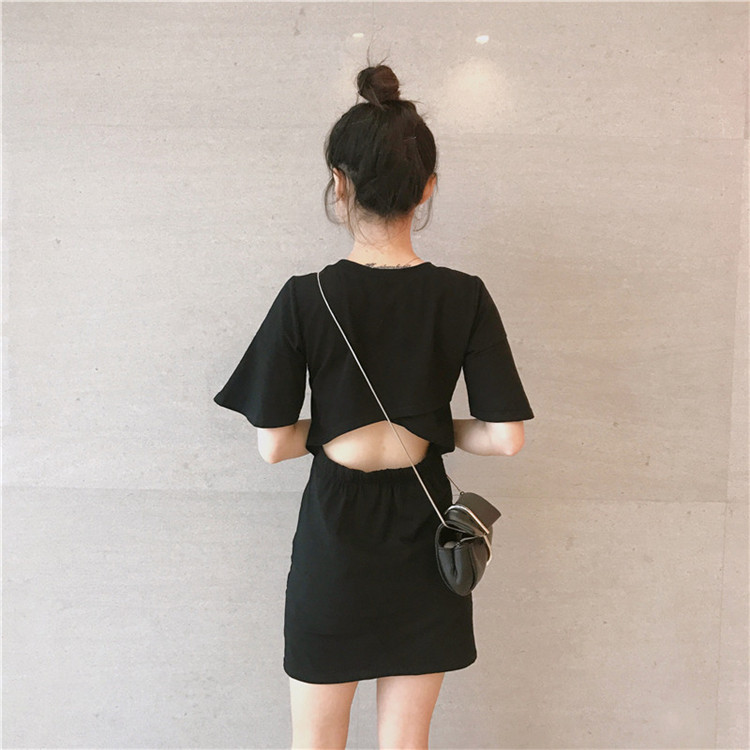 / 夏季新款女裝韓版chic風小心機后背鏤空氣質百搭純色短袖連衣裙女
