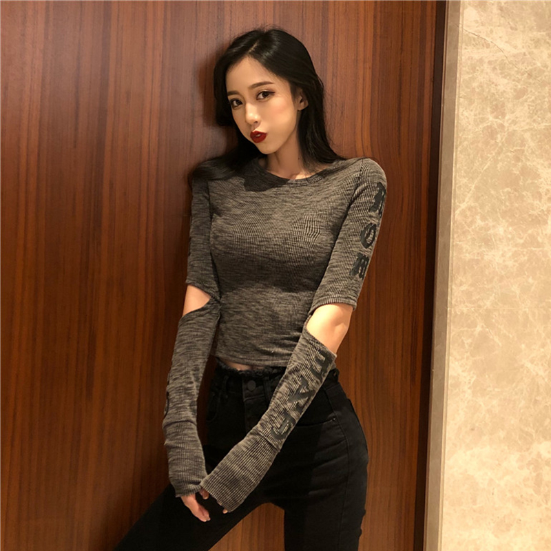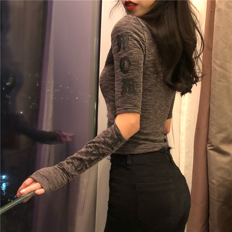 露臍短款上衣女秋裝新款修身個性袖口破洞打底衫復古字母長袖T恤
