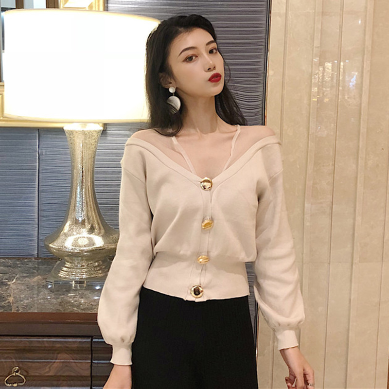 / 秋裝女2018新款網紗拼接V領毛衣開衫韓版高腰時尚長袖短外套上衣