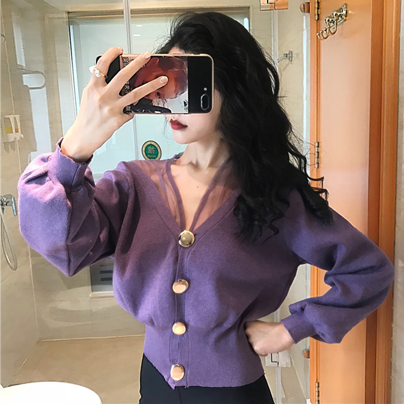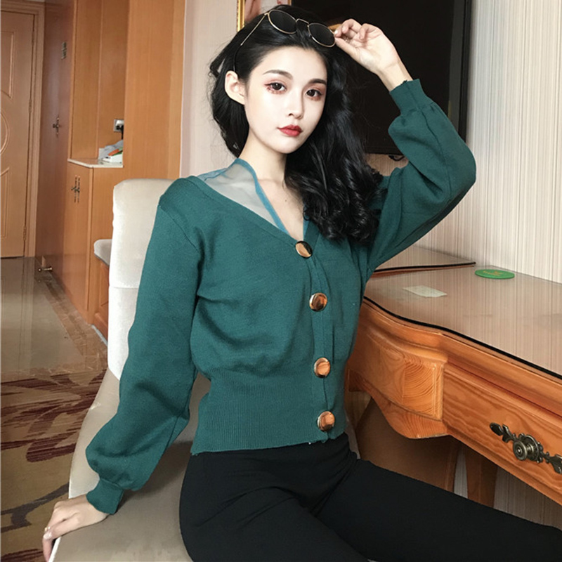 秋裝女2018新款網紗拼接V領毛衣開衫韓版高腰時尚長袖短外套上衣