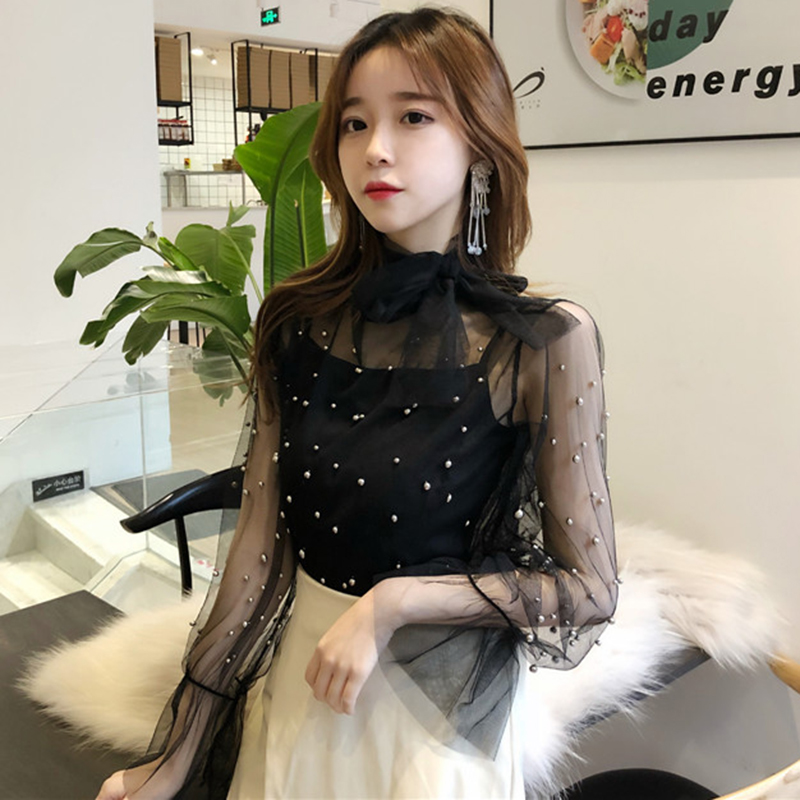 / 早春新款女裝蝴蝶結系帶珠珠荷葉袖網紗上衣+打底吊帶學生兩件套