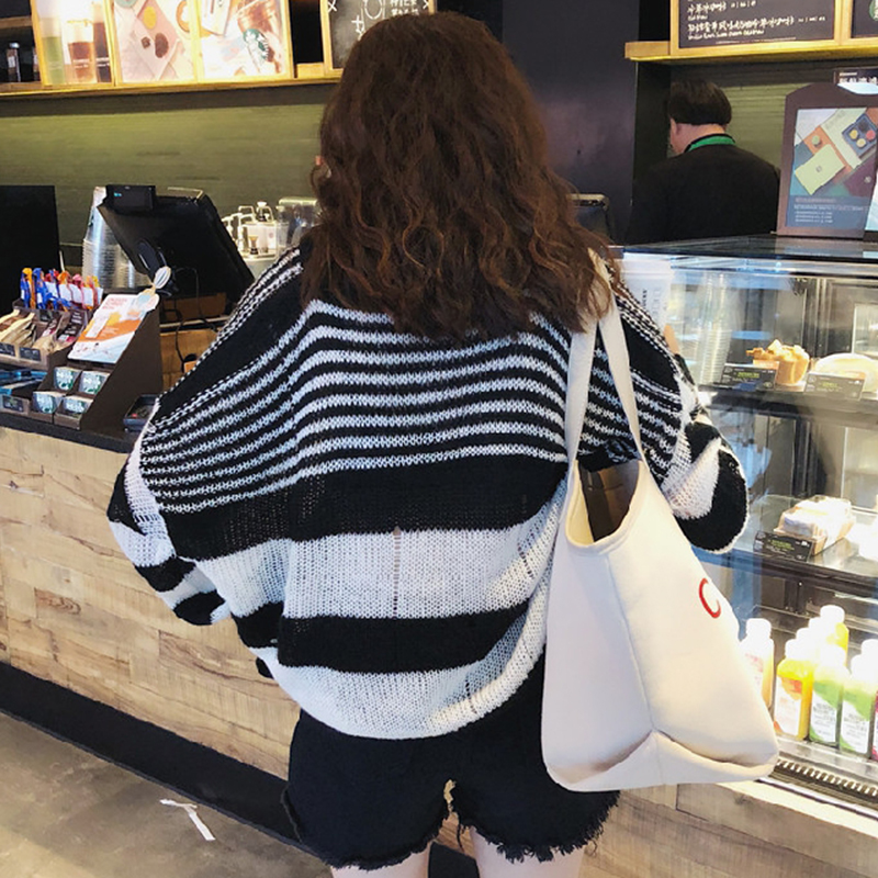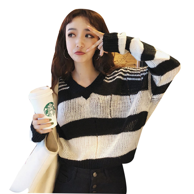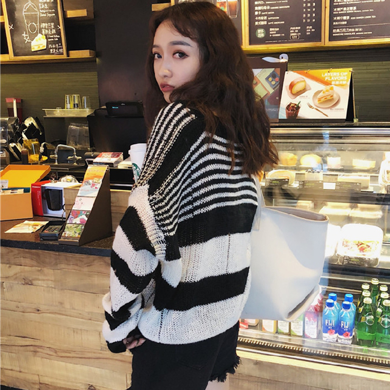 秋裝女2018新款韓版學生寬松V領條紋毛衣慵懶劃破針織衫長袖上衣
