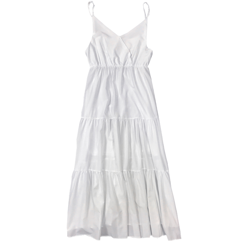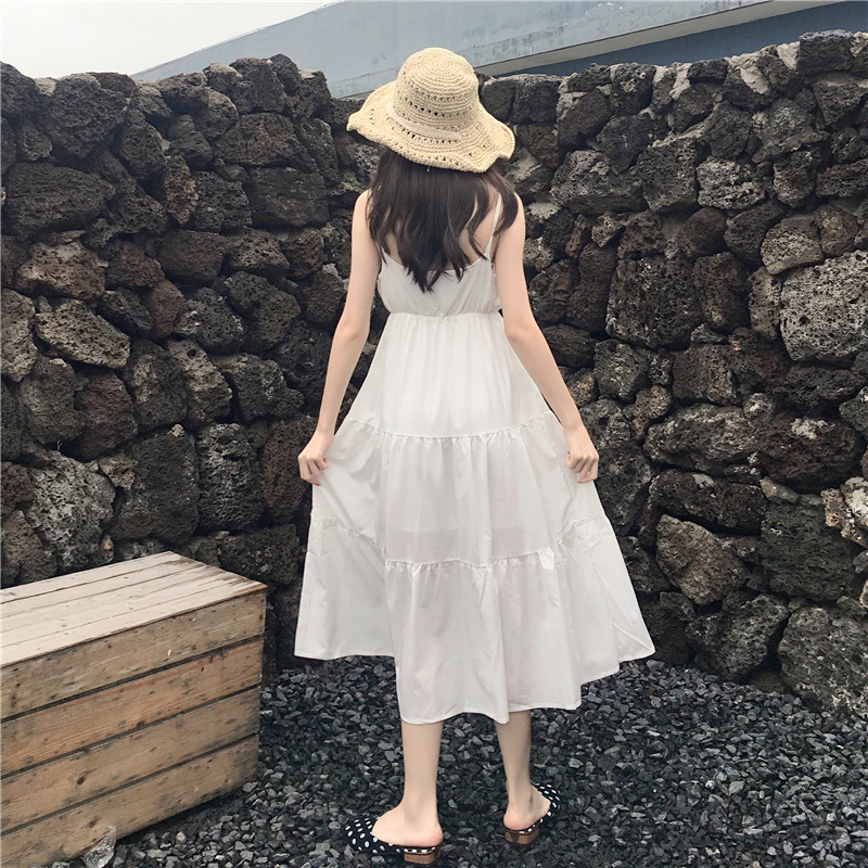 / 秋裝2018新款 夏季大碼女裝高腰顯瘦V領白色收腰吊帶連衣裙子女