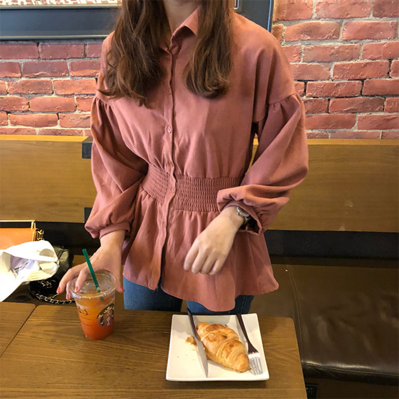 / 秋季女裝韓版氣質收腰顯瘦復古純色燈籠袖襯衫學生長袖襯衣上衣潮