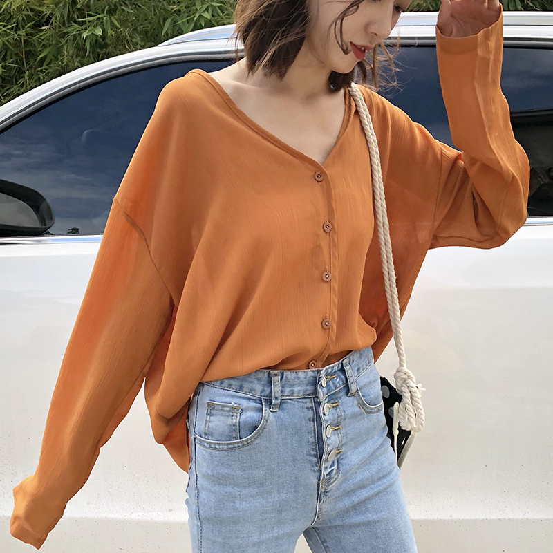 港風氣質polo衫早秋新款女裝時尚休閑寬松黑色襯衫V領長袖上衣潮