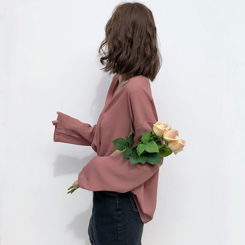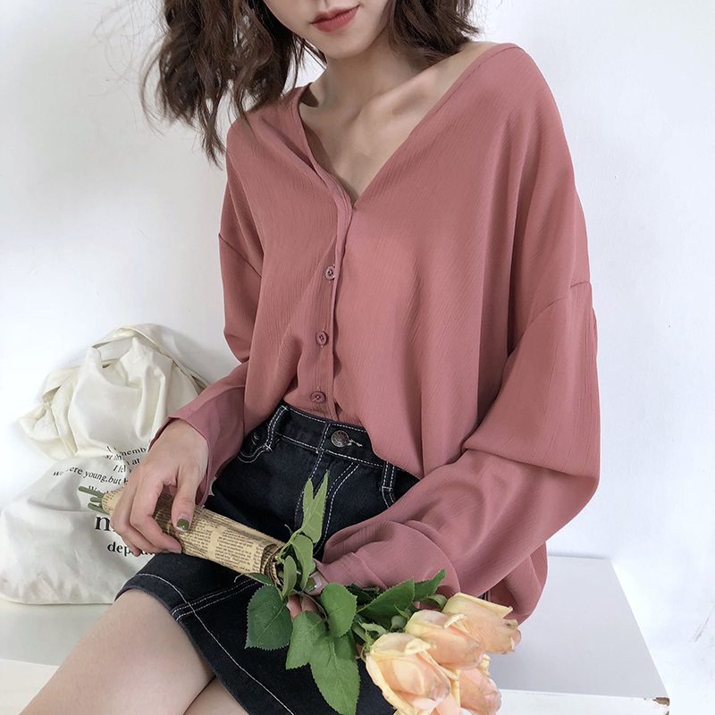 / 港風氣質polo衫早秋新款女裝時尚休閑寬松黑色襯衫V領長袖上衣潮