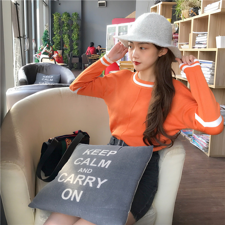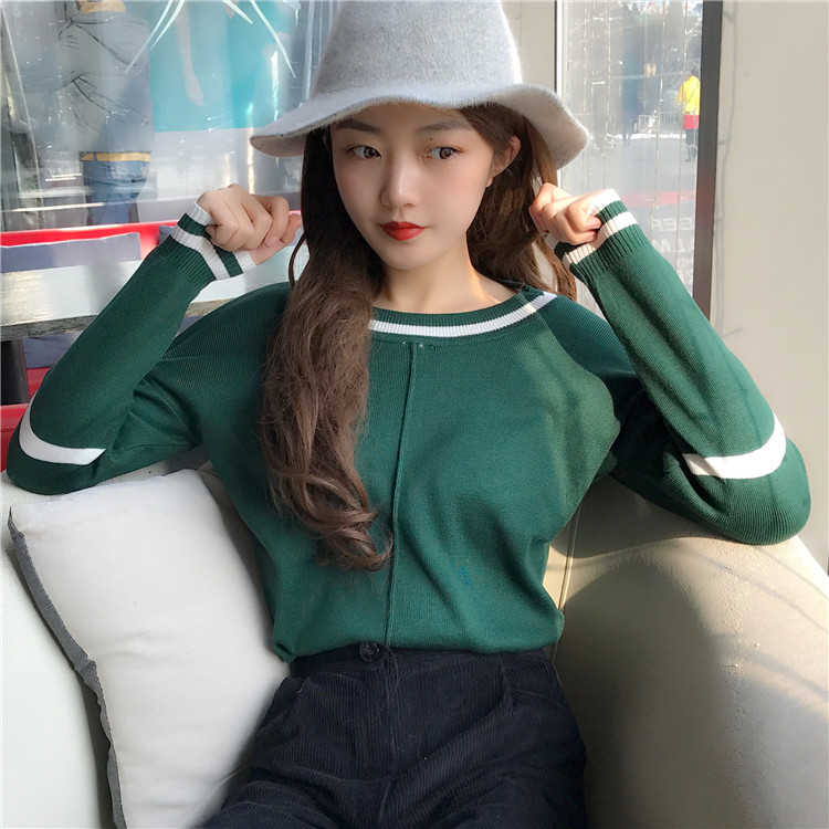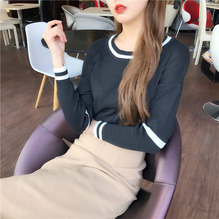/ 韓國秋冬款百搭撞色線條套頭螺紋圓領修身長袖打底衫針織衫女