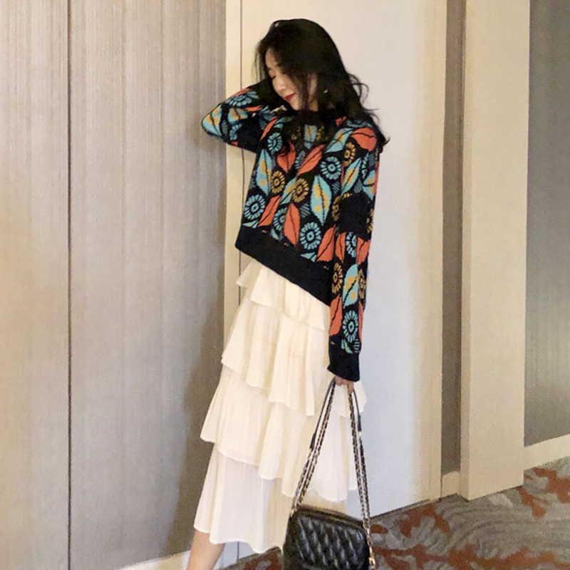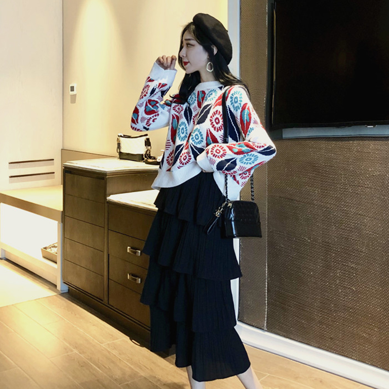 / 韓版時尚套裝女秋季新款寬松幾何長袖短針織毛衣高腰蛋糕半身裙子