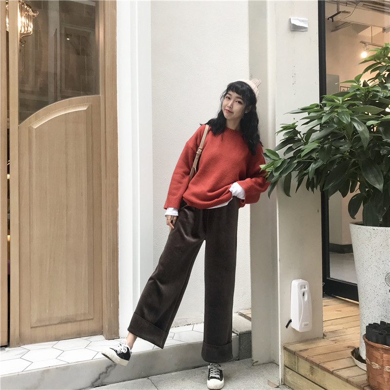 / 秋冬韓版復古寬松百搭加厚天鵝絨闊腿褲高腰直筒褲九分褲休閑褲女