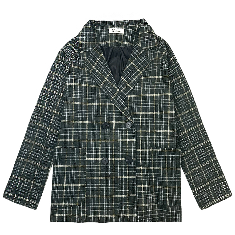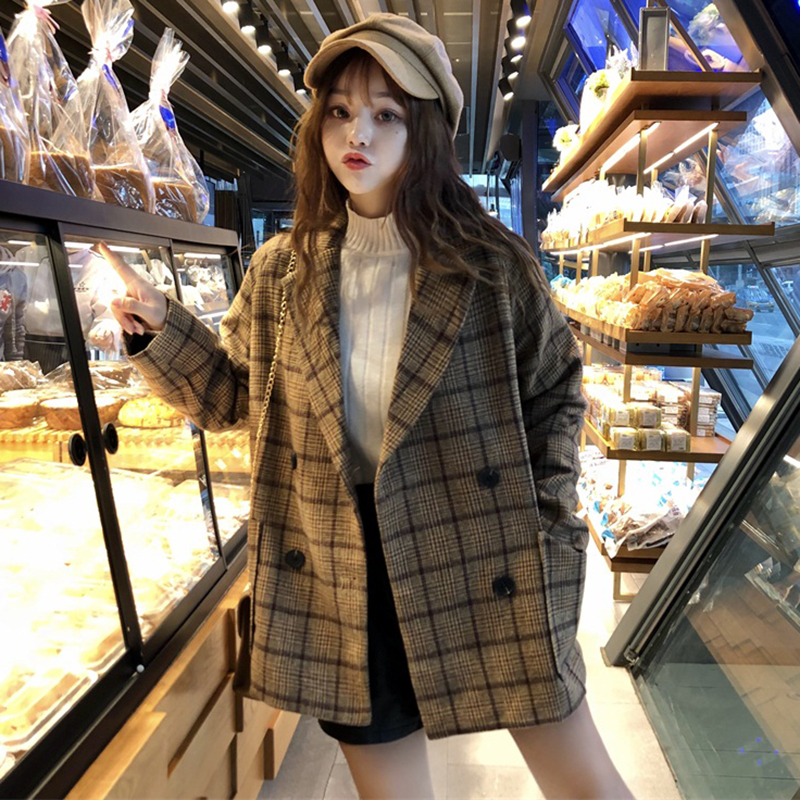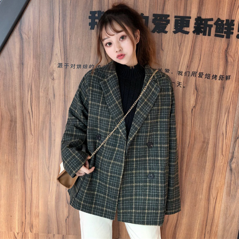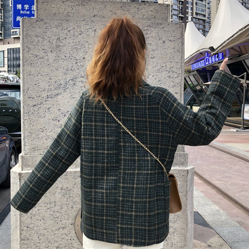 / 復古港風學生寬松格子外套秋裝女2018新款中長款毛呢西裝長袖上衣