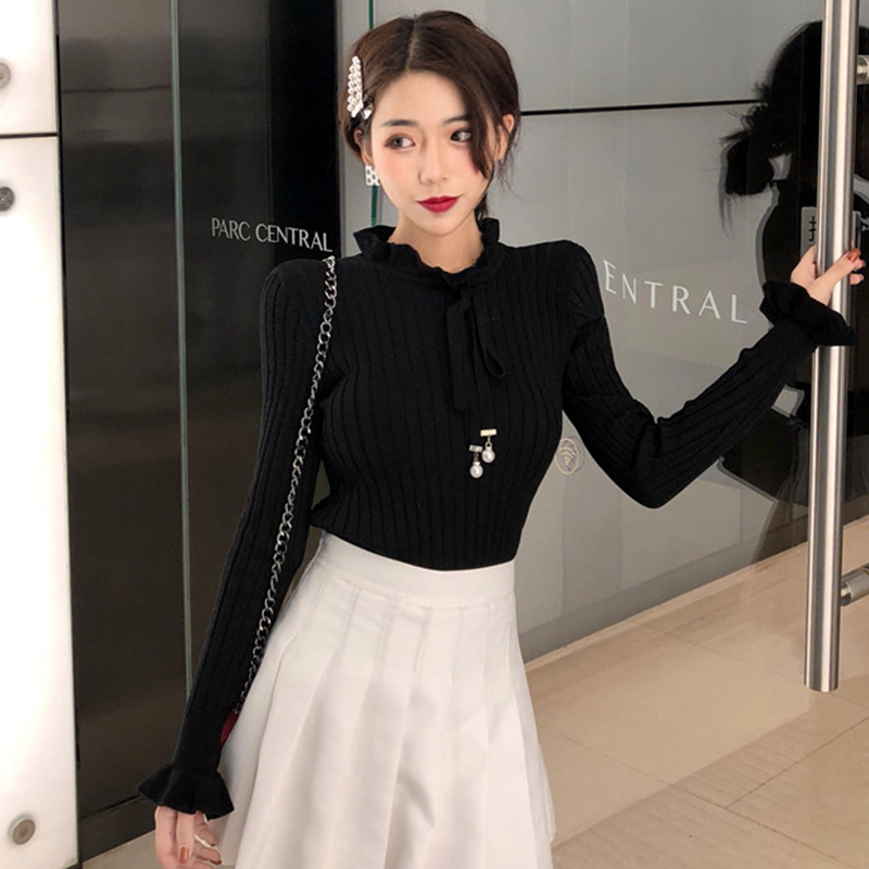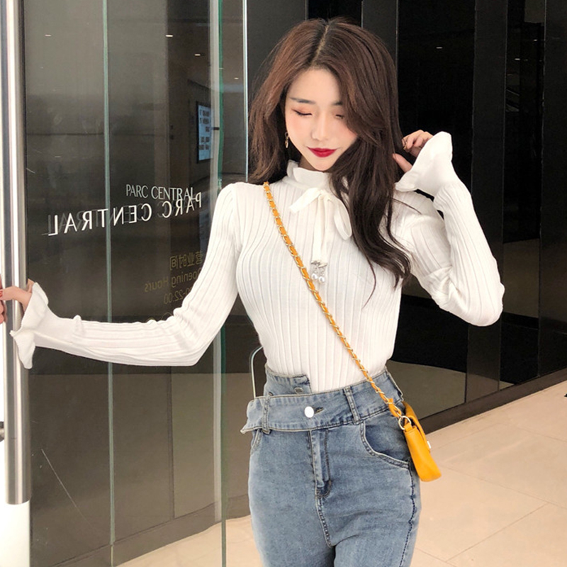 / 秋冬裝2018新款系帶半高領打底針織衫女修身顯瘦長袖白色時尚上衣