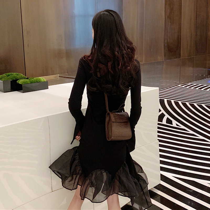連衣裙女秋冬裝2018新款網紗拼接魚尾長袖打底裙黑色高腰中長裙子