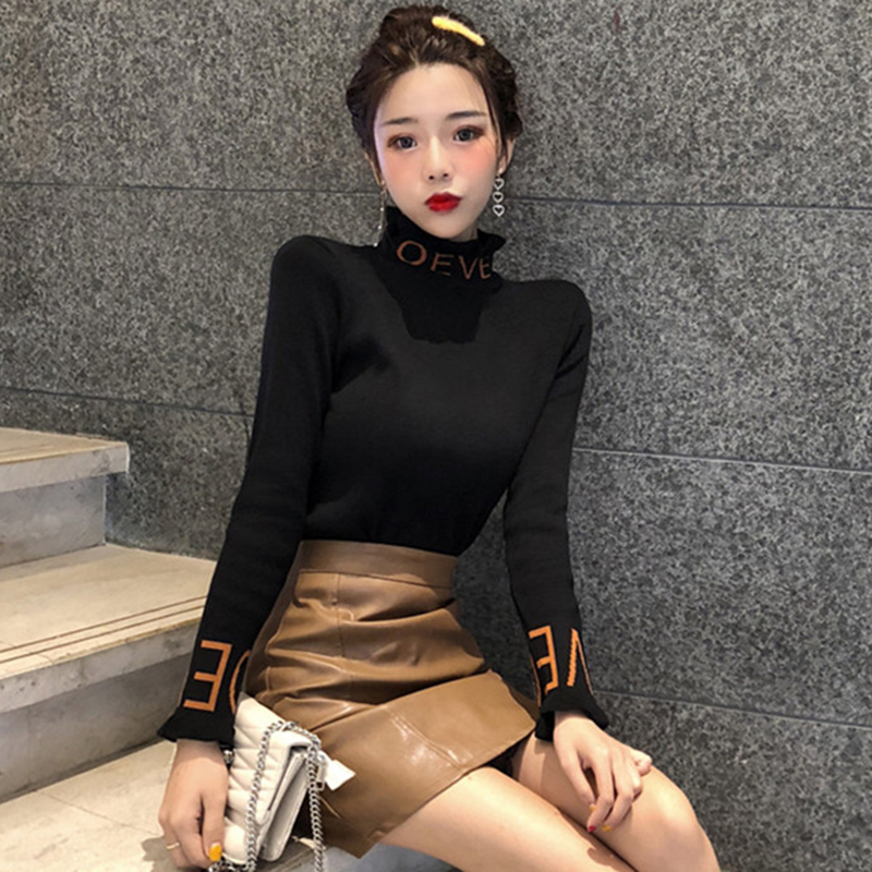 時尚字母刺繡打底針織衫女秋裝新款套頭毛衣木耳邊高領長袖上衣潮