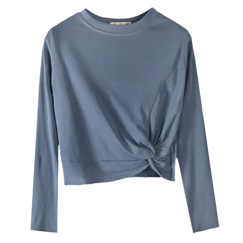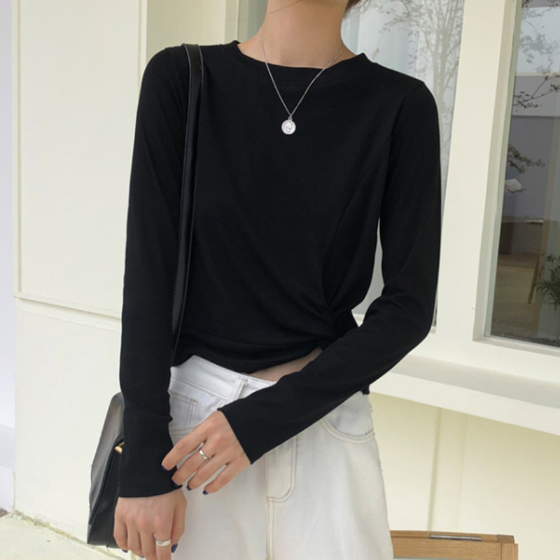 時尚短上衣秋裝女2018新款韓版修身圓領打底衫學生打結長袖黑T恤