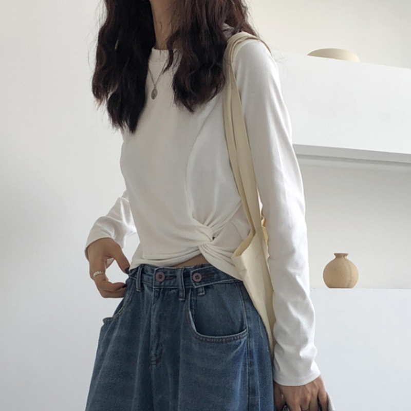 / 時尚短上衣秋裝女2018新款韓版修身圓領打底衫學生打結長袖黑T恤