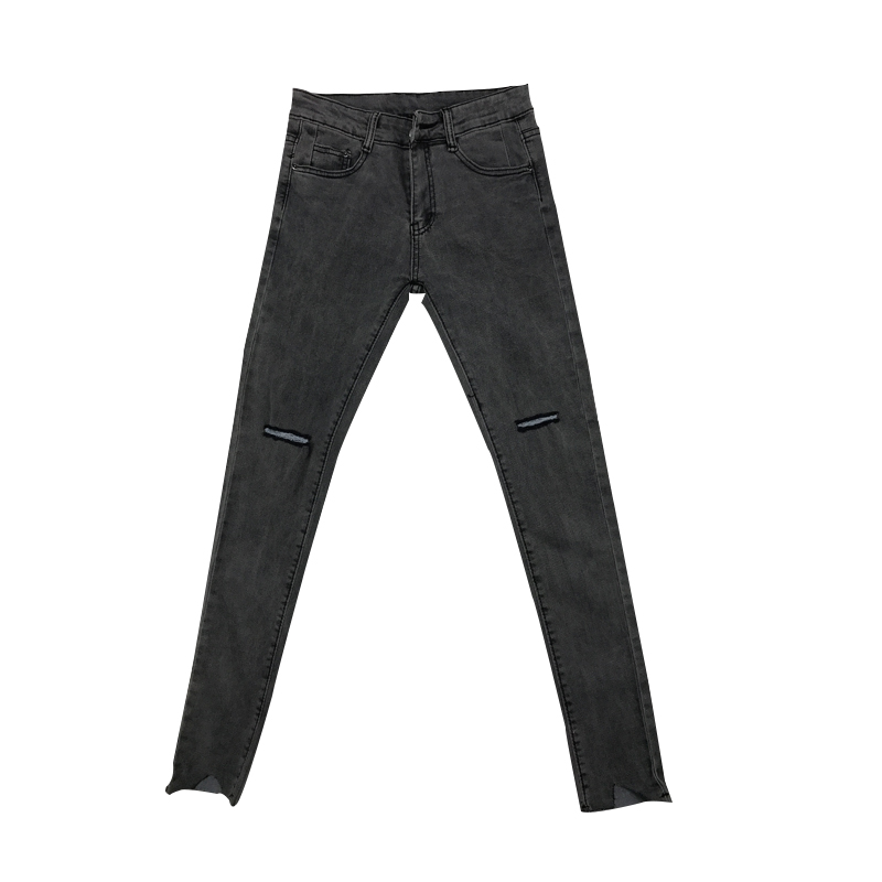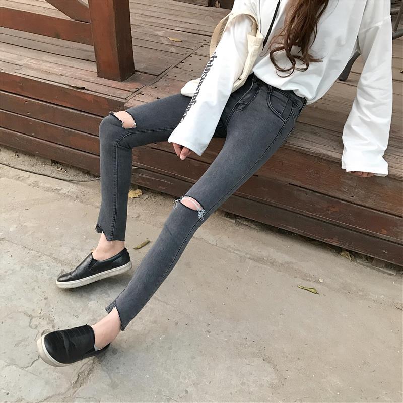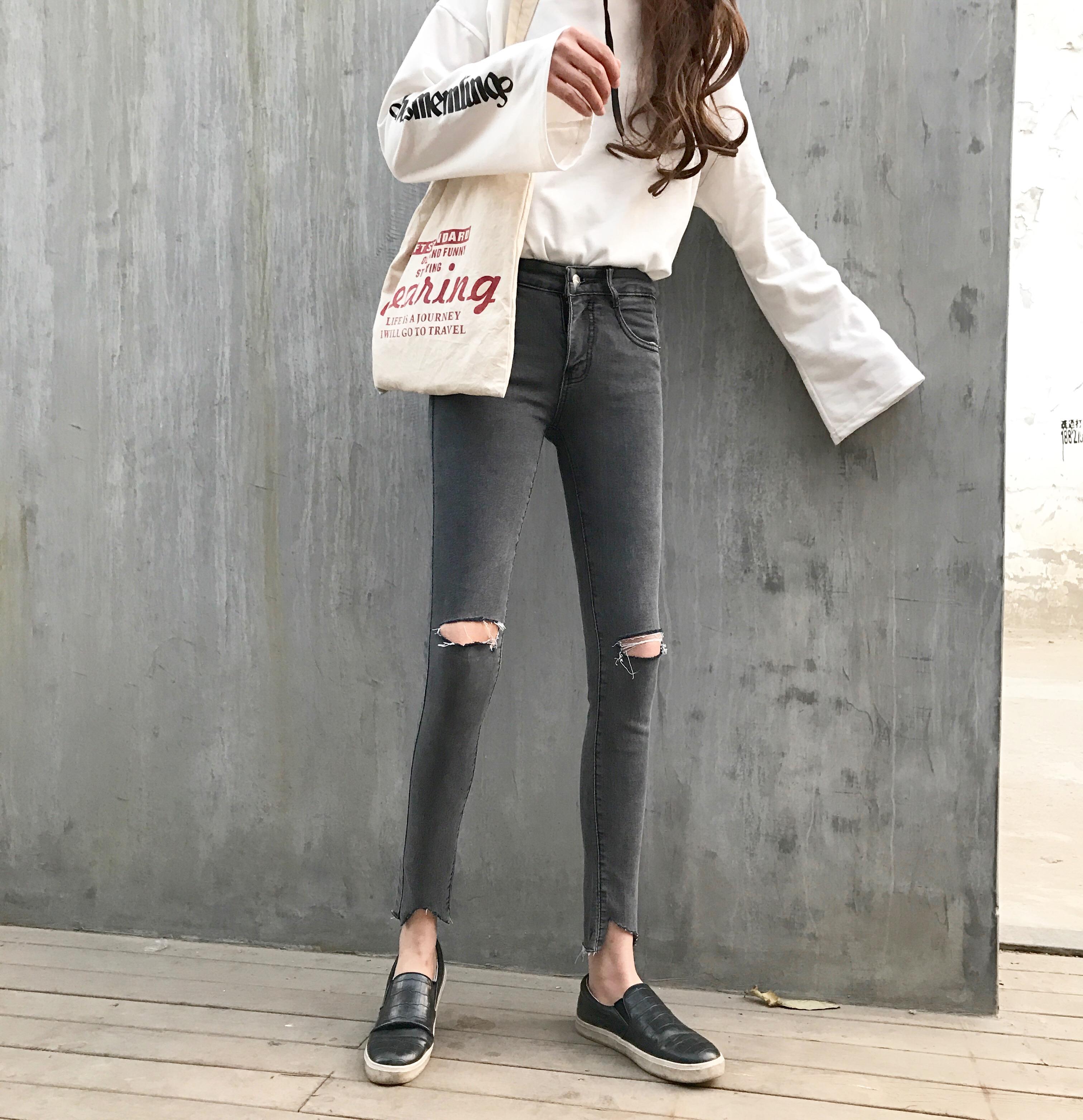 早春新款女裝灰色膝蓋破洞彈力高腰修身顯瘦毛邊小腳鉛筆牛仔褲女