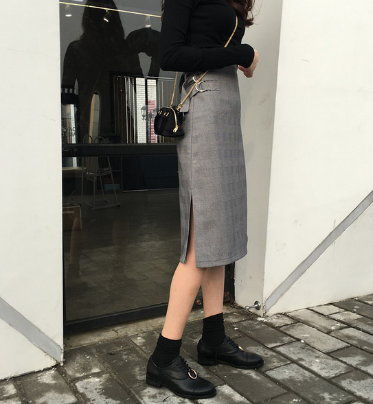 / 秋冬韓國chic復古氣質開叉高腰顯瘦格子中裙修身打底衫女套裝