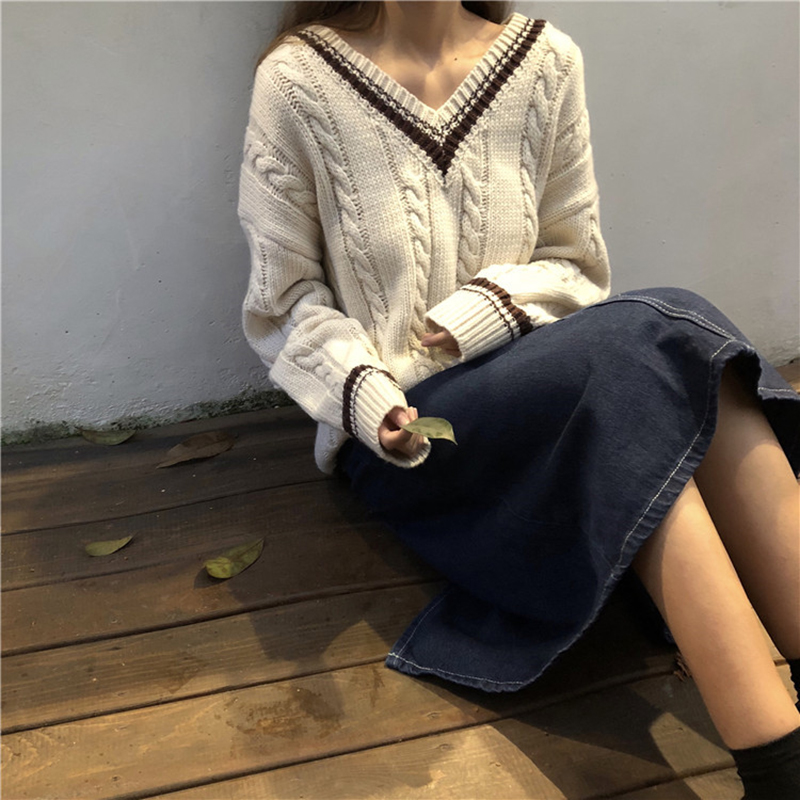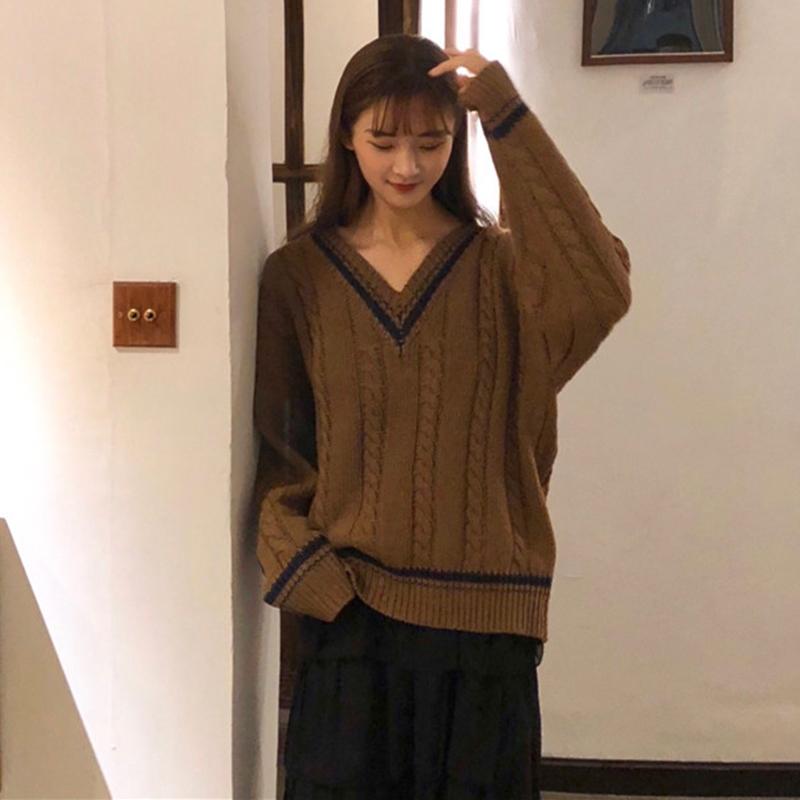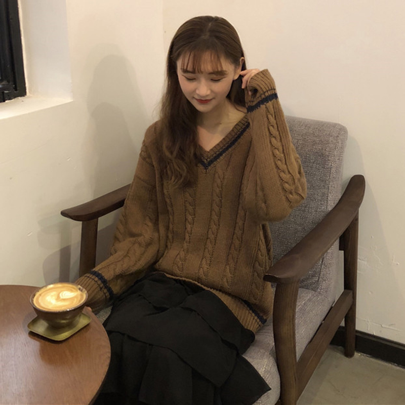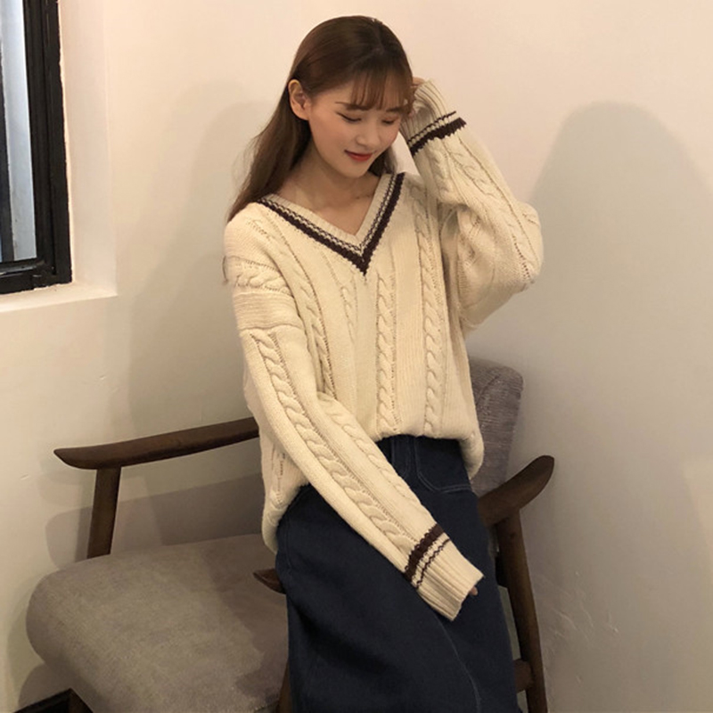 女冬裝2018新款韓版寬松V領撞色麻花毛衣外套學生休閑長袖針織衫