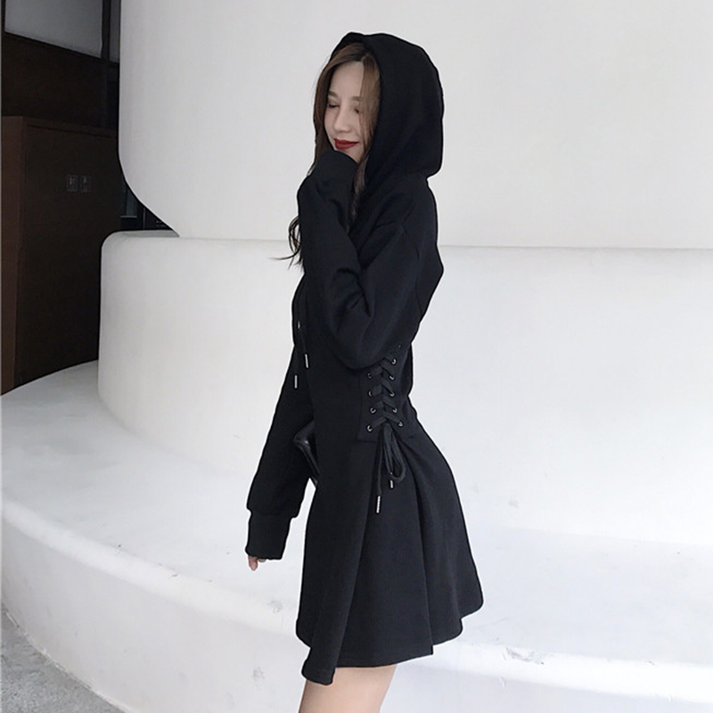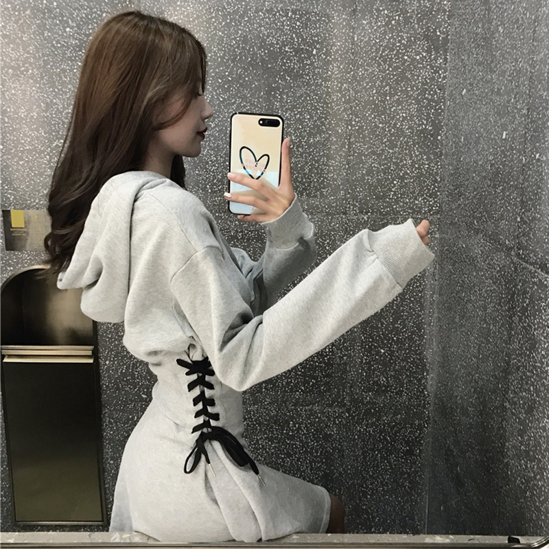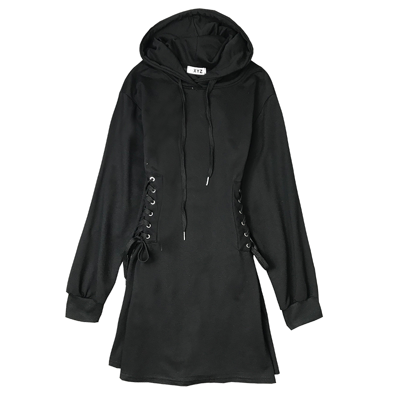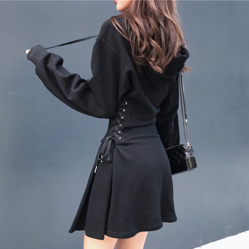 秋裝女2018新款韓版小心機綁帶收腰連衣裙學生修身連帽A字裙子潮