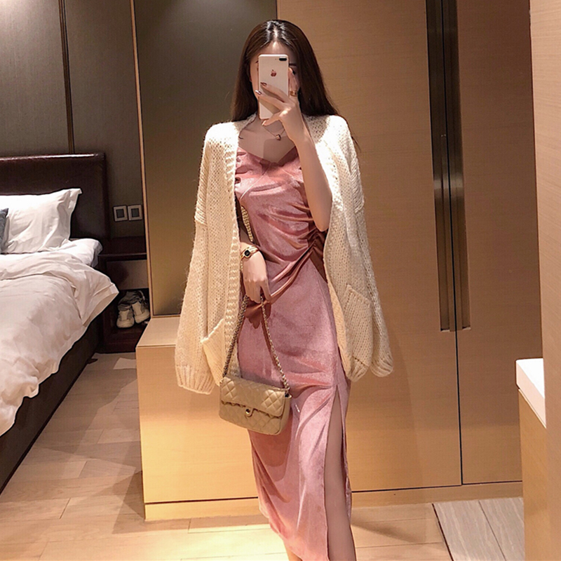 女神套裝秋2018新款氣質絲絨吊帶裙開叉打底連衣裙子寬松粗線毛衣