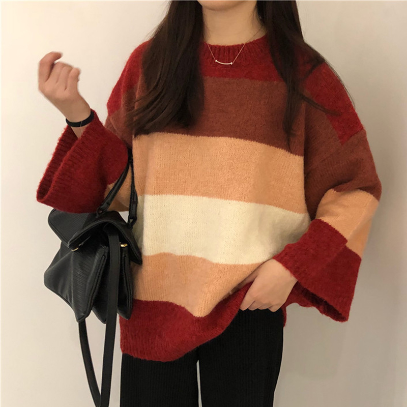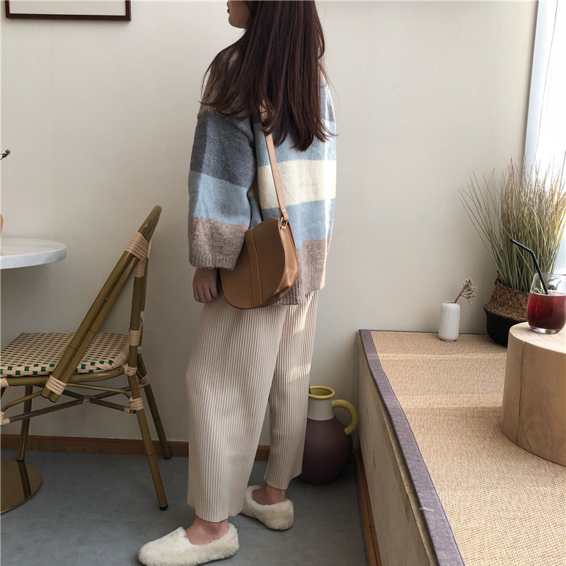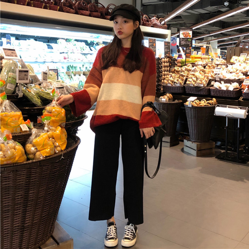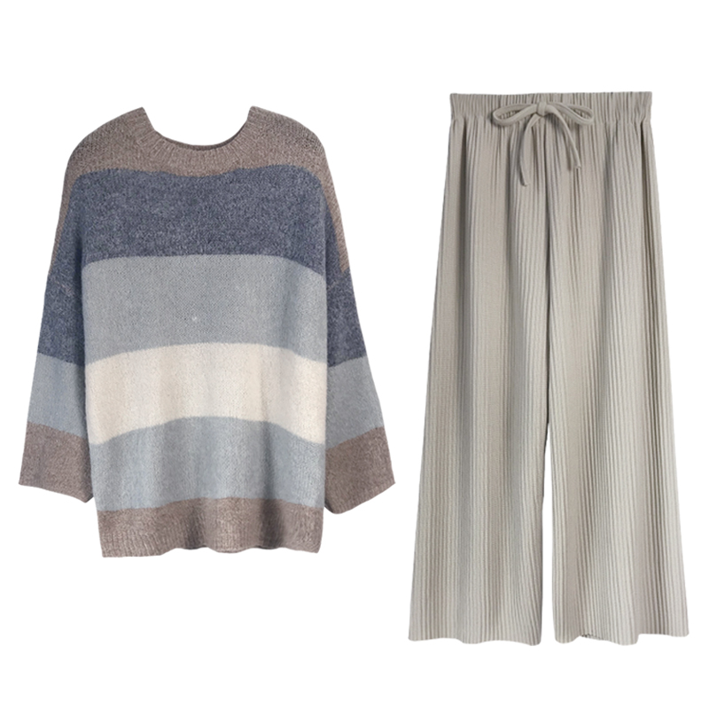 / 時尚套裝女秋季新款寬松拼色圓領套頭毛衣高腰條紋綁帶闊腿長褲子