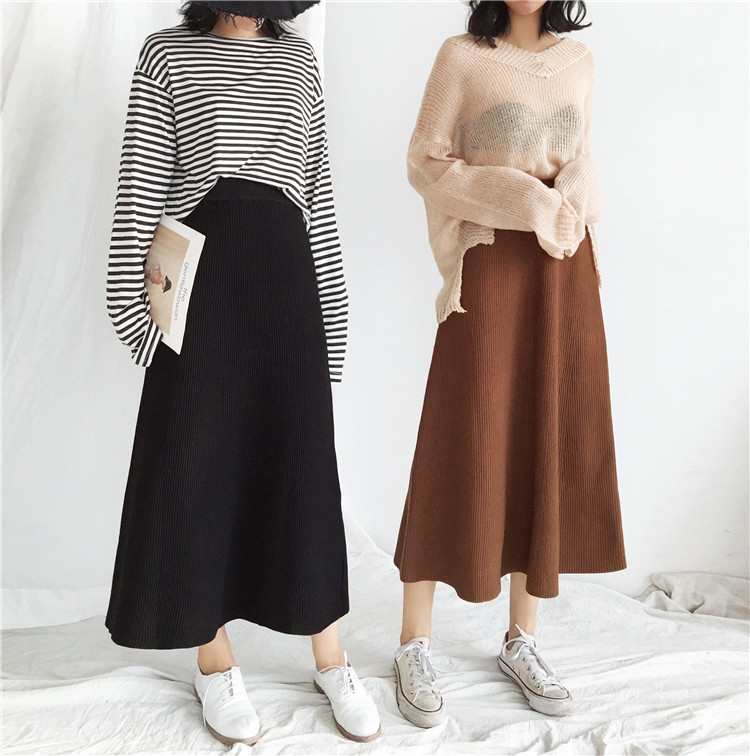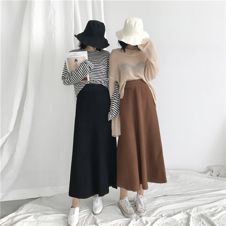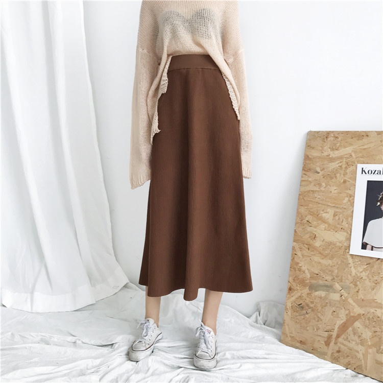 chic復古韓版高腰針織半身裙女秋冬2018中長裙純色學生A字裙傘裙