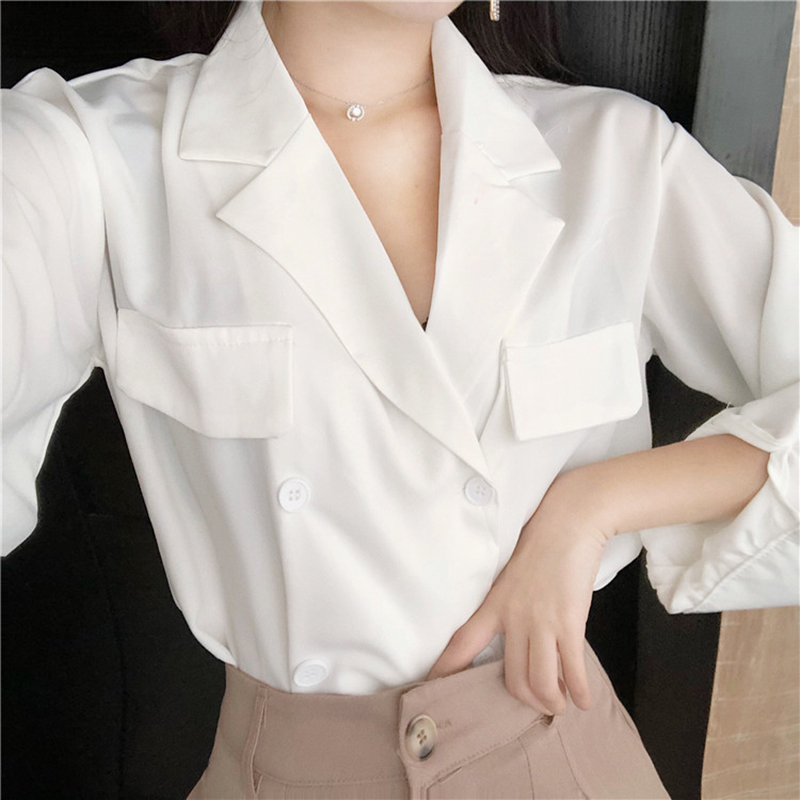 / 秋裝2018新款韓版氣質西裝領長袖白襯衫寬松顯瘦薄款女生時尚上衣