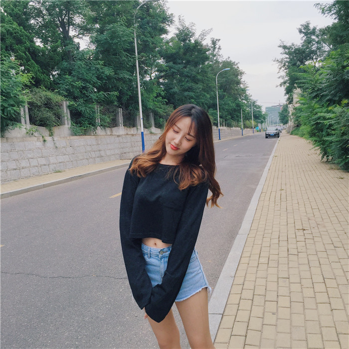 / 春夏新款女裝韓版純色百搭寬松漏肚臍長袖上衣顯瘦短款白色t恤女