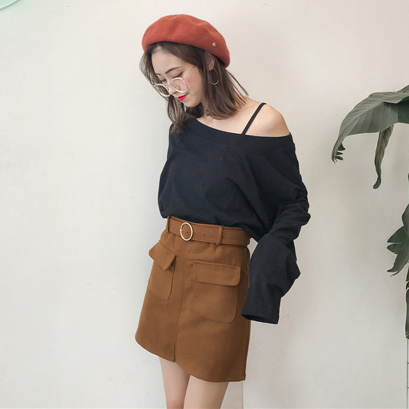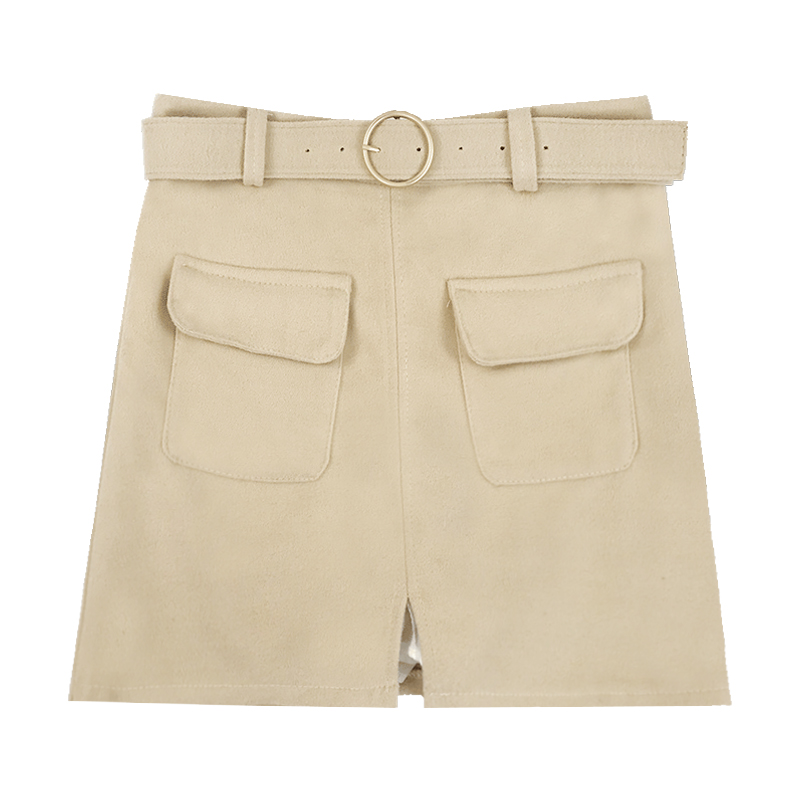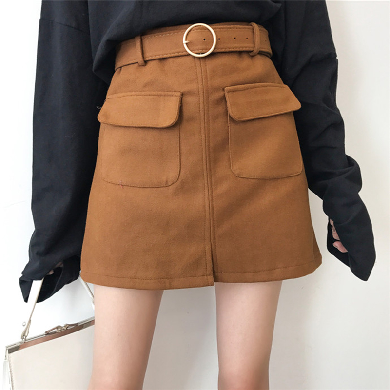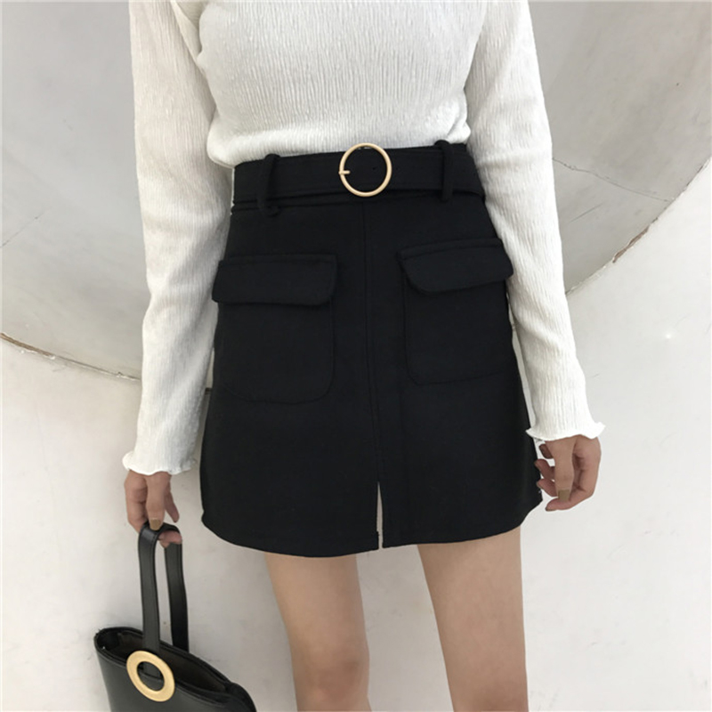 / 腰帶高腰短裙女秋冬裝新款氣質純色大口袋開叉毛呢子A字半身裙潮
