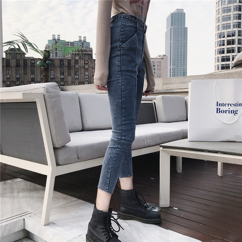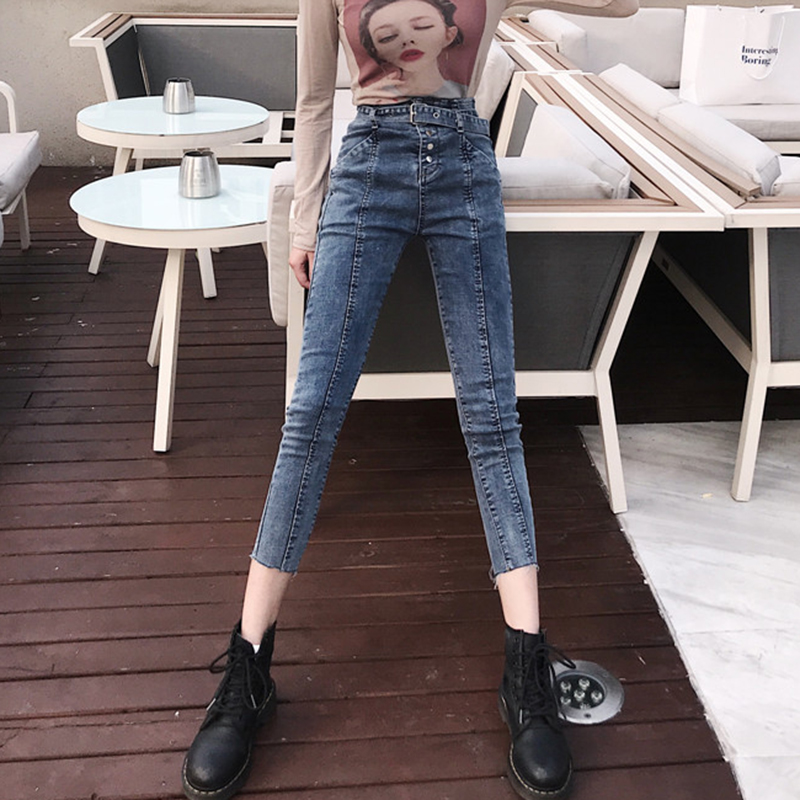 黑色牛仔褲秋裝女2018新款修身高腰單排扣九分小腳鉛筆褲打底褲子