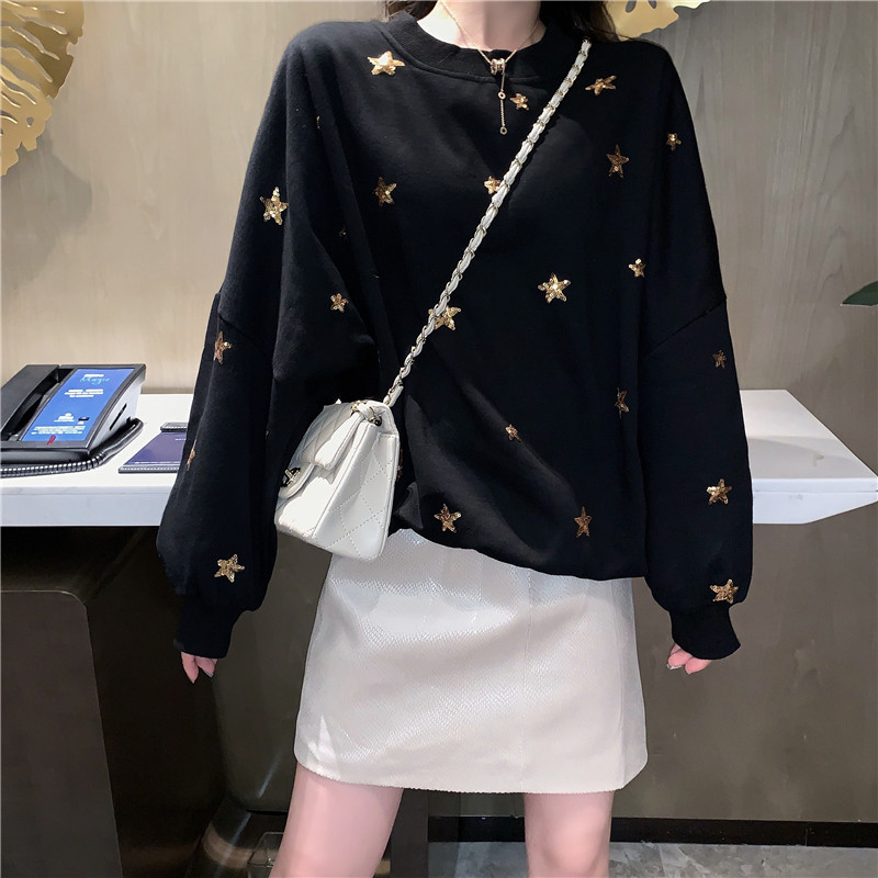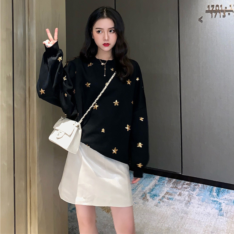 / 時尚套裝秋冬女2018新款寬松星星刺繡衛衣氣質高腰顯瘦A字皮短裙