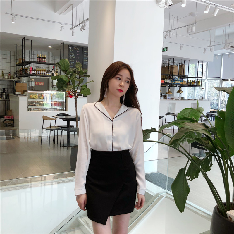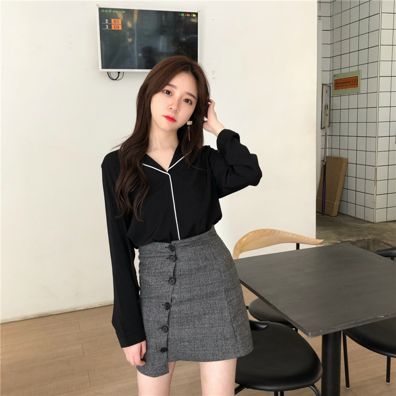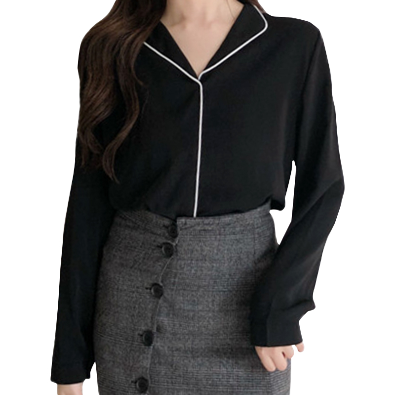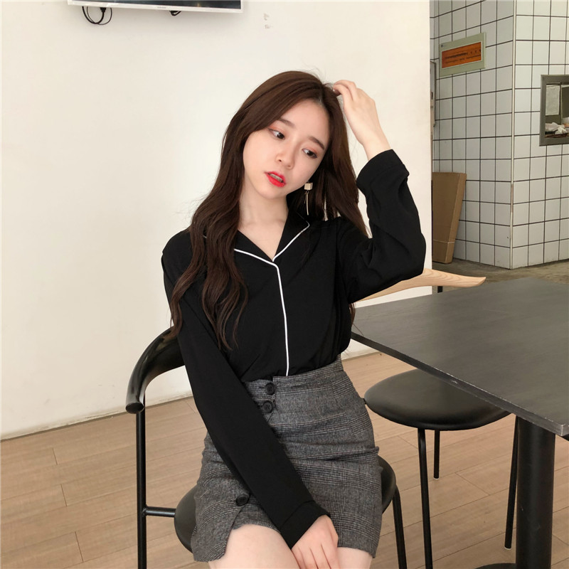 / 春季新款女裝氣質V字翻領寬松顯瘦簡約拼色學生長袖雪紡衫女上衣
