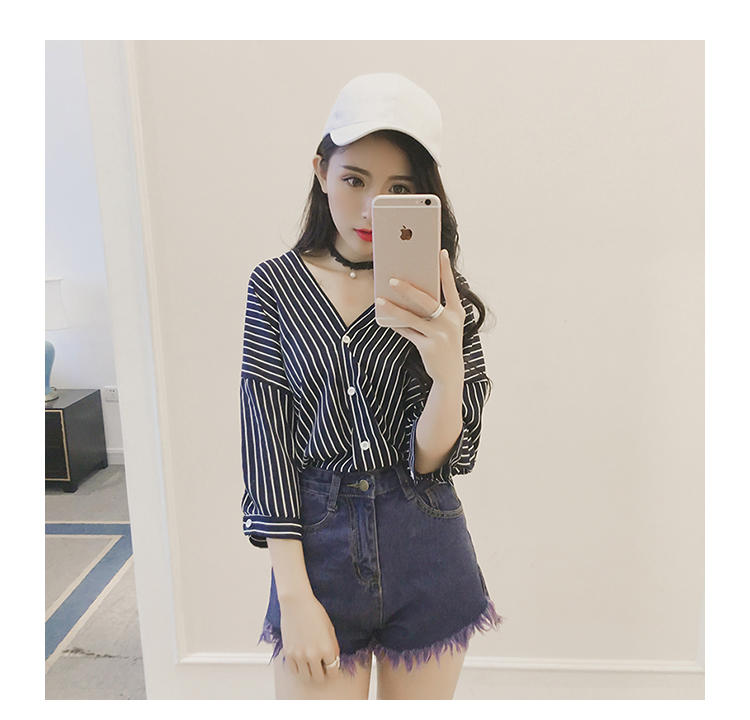 春秋裝新款女裝韓版修身條紋學生打底襯衣女前后V領露背中袖襯衫