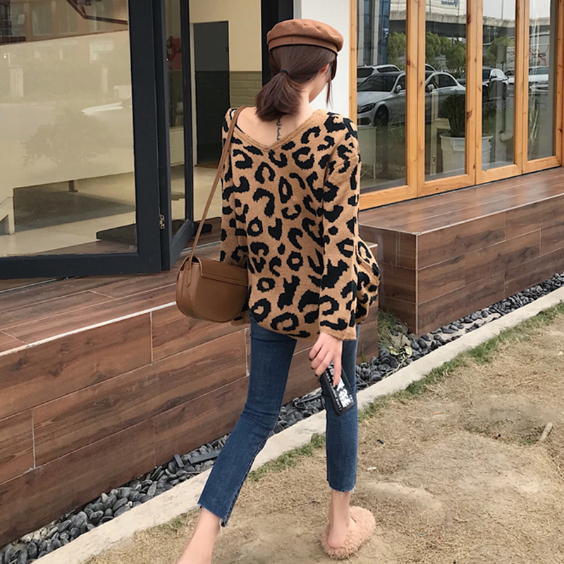 / 港味寬松保暖毛衣秋裝女2018新款復古豹紋長袖針織衫潮流V領上衣