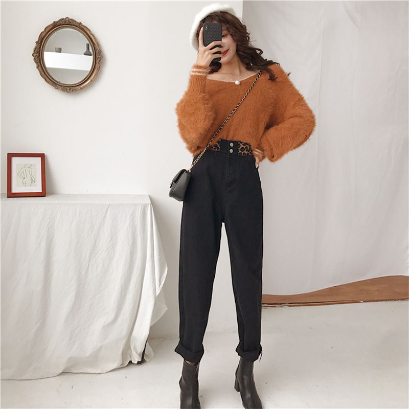 老爹褲女秋冬裝2018新款韓版撞色松緊高腰牛仔褲學生寬松哈倫褲子