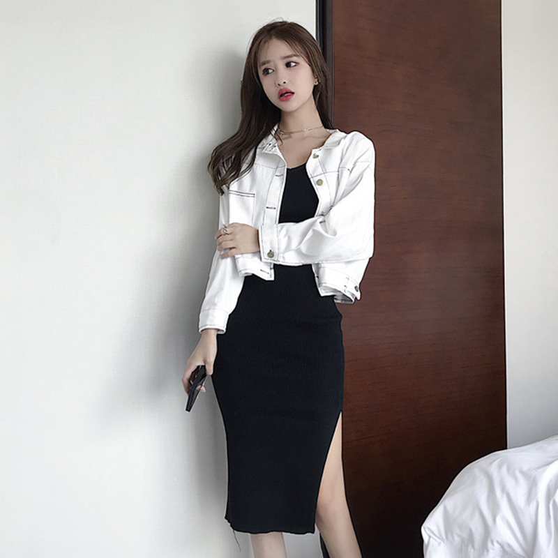 / 兩件套裝女秋新款翻領寬松長袖牛仔短外套氣質開叉針織吊帶連衣裙