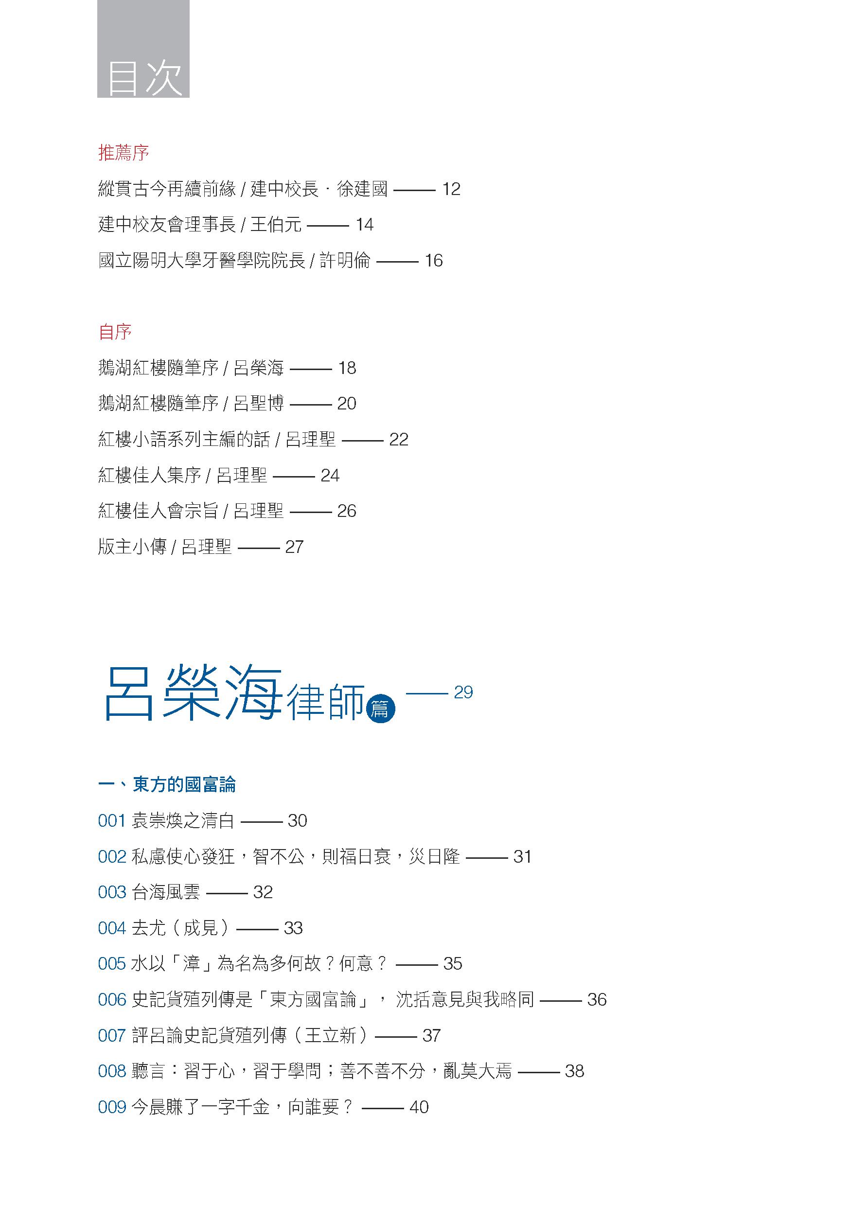 三位建中校友合寫) 內容: 1:愛情散文/詩詞,旅遊小記,生活記事。 2:武俠小說。 3:儒學,理學,法學,史學,古文今評,時事針砭,歷史辯証,人生感悟,養生建議。 4:建中紅樓故事,趣談。 作者簡介: 1:呂榮海:律師,台灣鵝湖書院創辦人。 2:呂聖博:牙醫師,美國傳奇牙醫診所院長。 3:呂理聖:建中校友會副總幹事,公版-台北市建國中學校友會line群組管理人,建中紅樓佳人會版主。