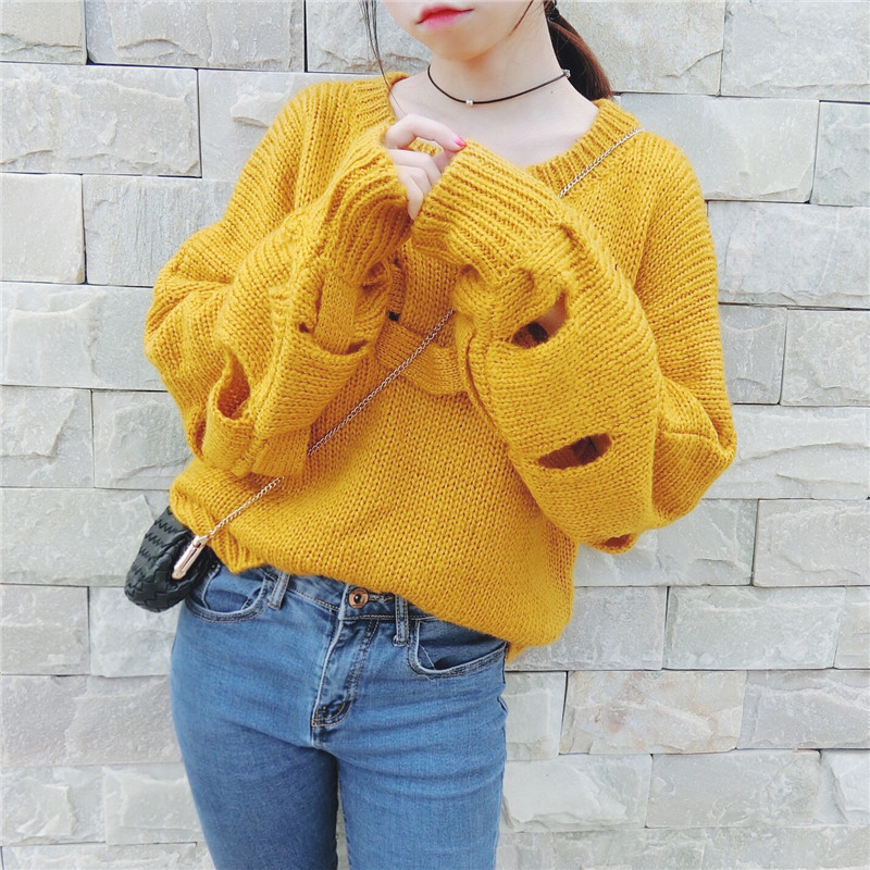 / 學院風冬款韓國chic鏤空粗麻花姜黃編織針織泡泡袖毛線毛衣女
