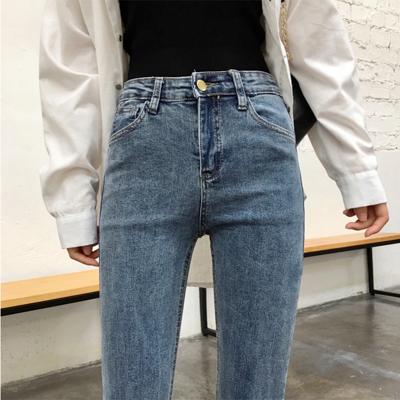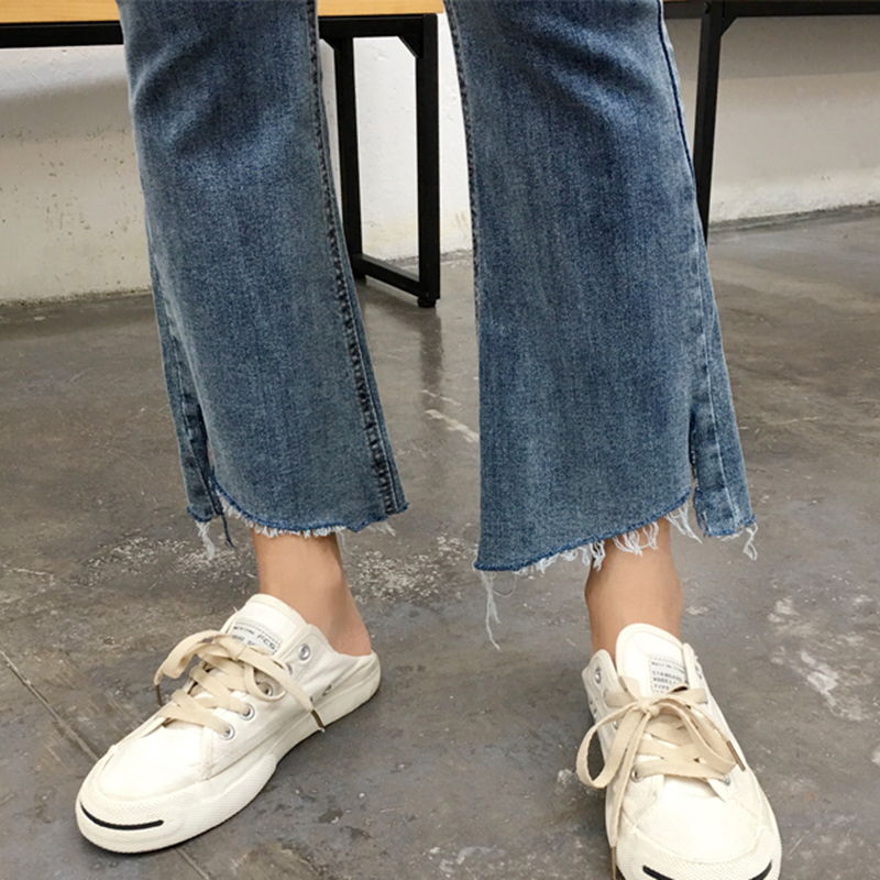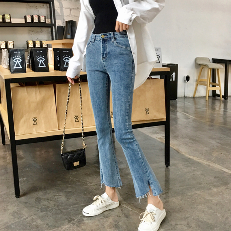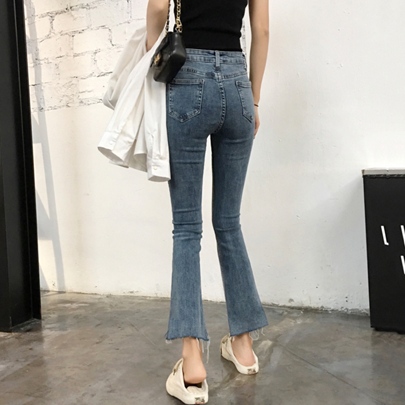 秋裝女2018新款高腰顯瘦不規則復古微喇叭褲子學生毛邊九分牛仔褲
