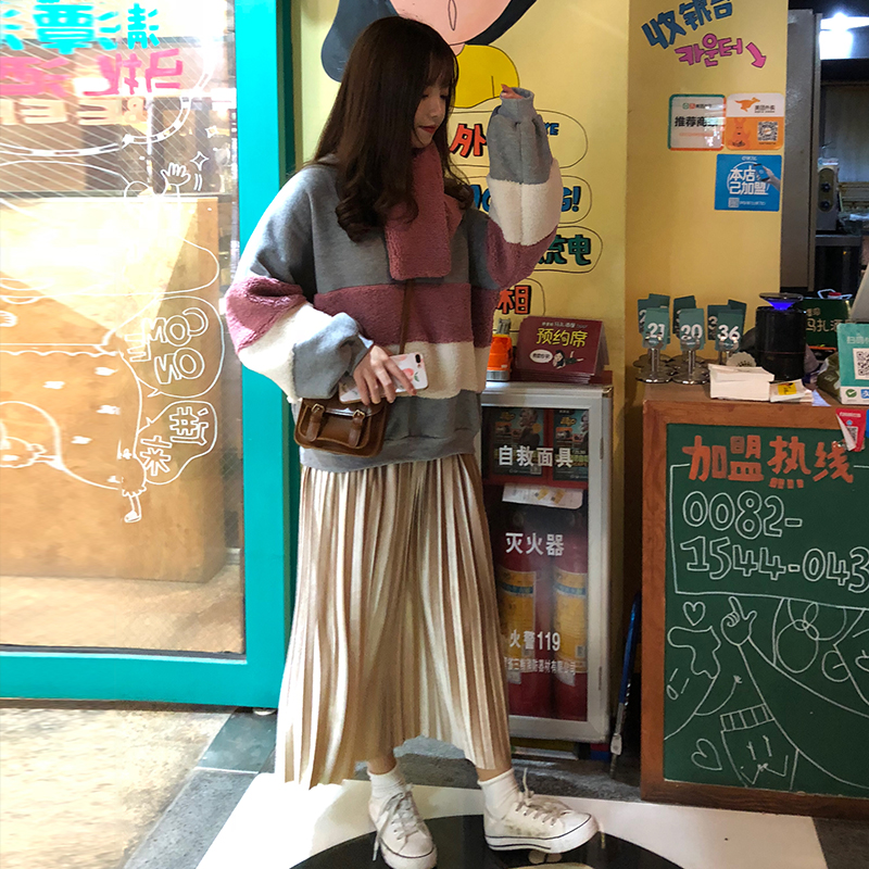 可可里小姐~時尚休閑仿羊羔毛拼接加絨衛衣+絲絨半身裙