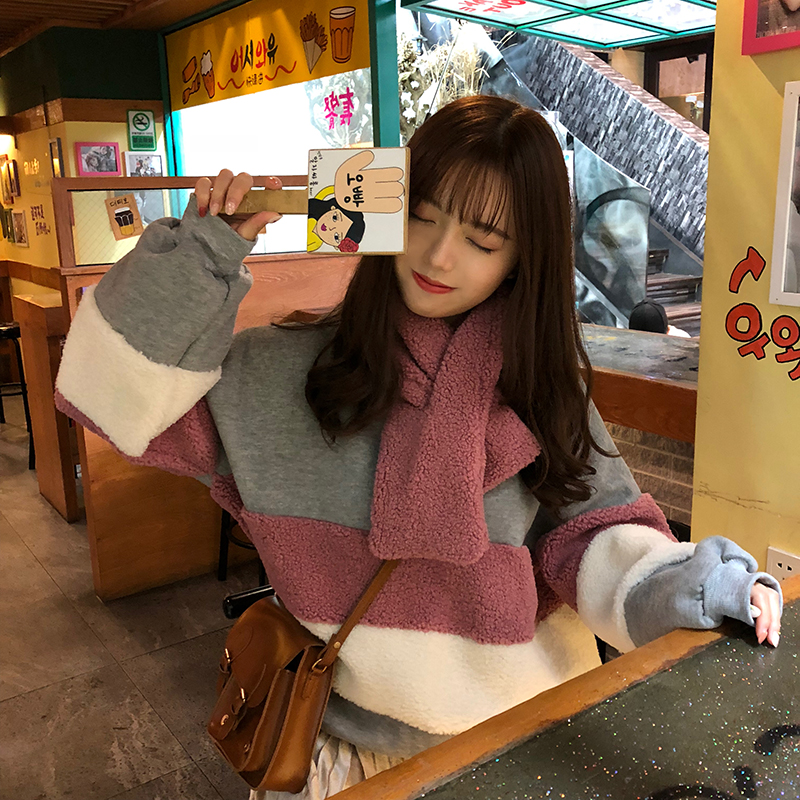 / 可可里小姐~時尚休閑仿羊羔毛拼接加絨衛衣+絲絨半身裙