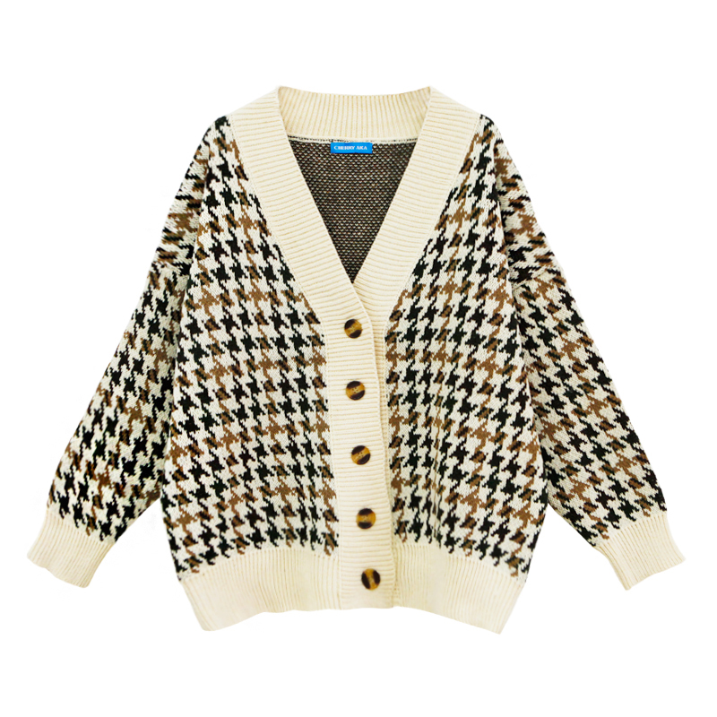 / 復古千鳥格開衫毛衣秋冬裝女2018新款學生寬松V領慵懶風休閑外套