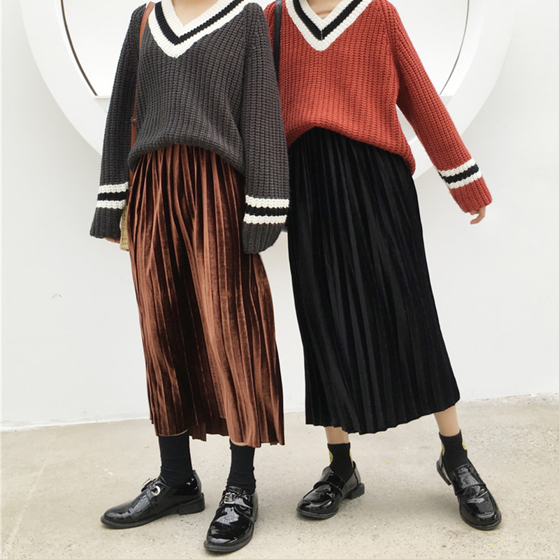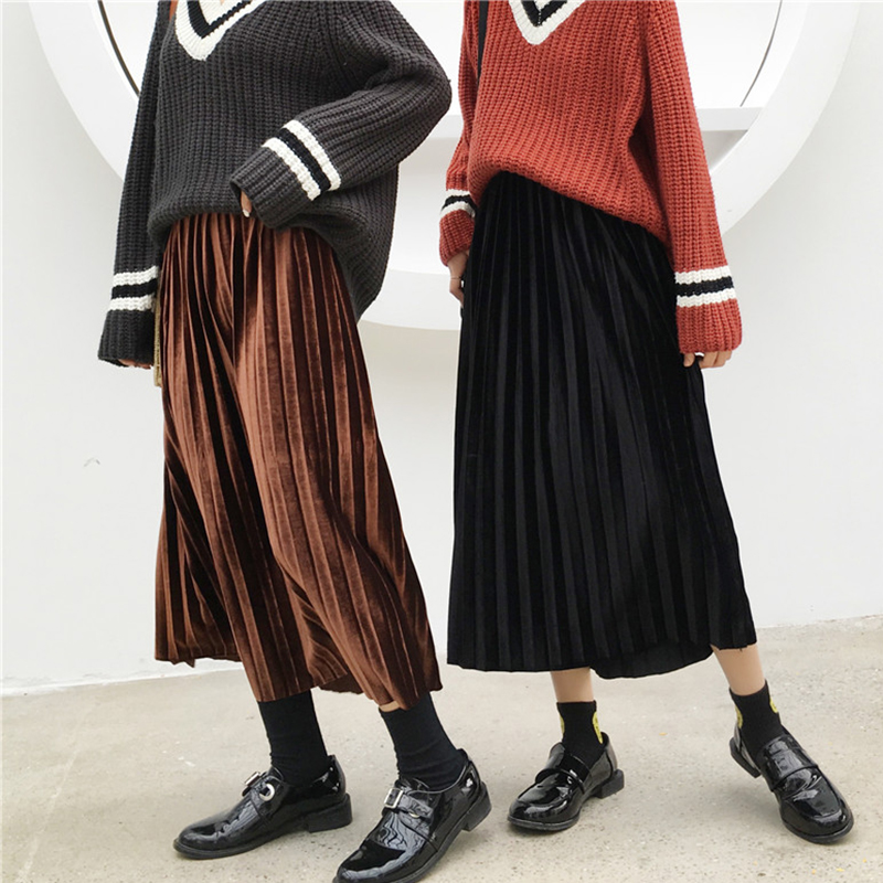 / 復古絲絨百褶裙秋裝女2018新款韓版高腰顯瘦中長裙學生A字半身裙