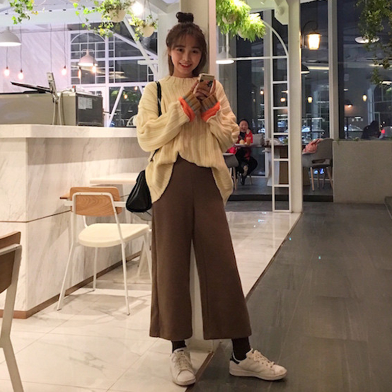 / 毛呢褲子女秋冬裝2018新款韓版學生高腰顯瘦闊腿褲寬松休閑九分褲