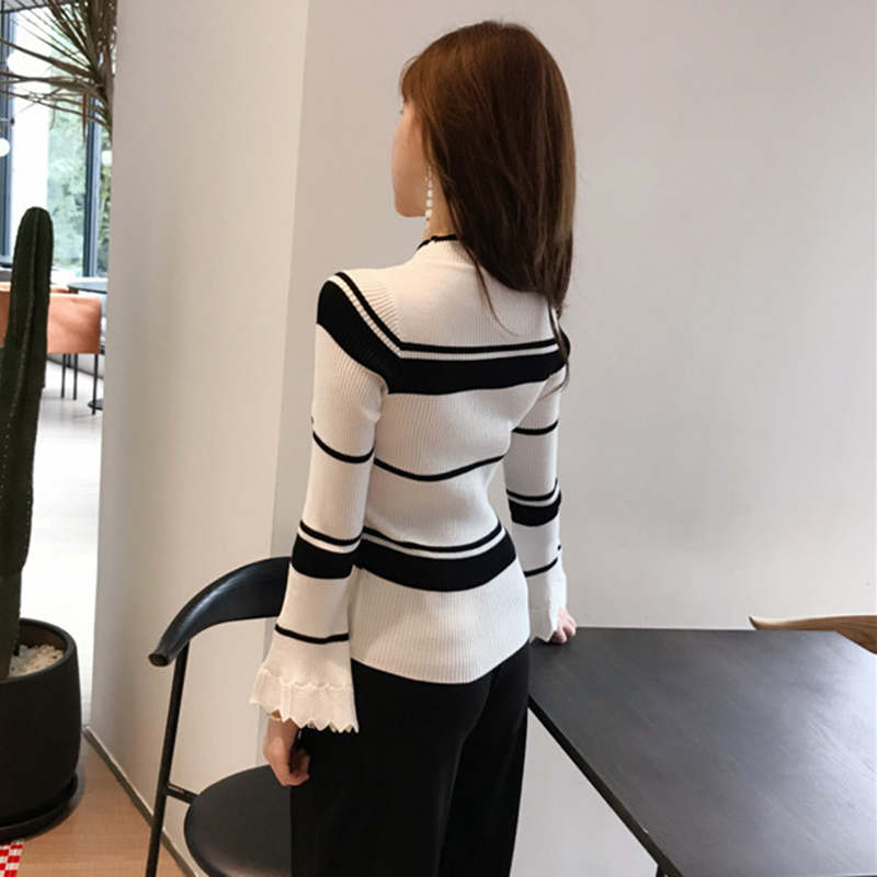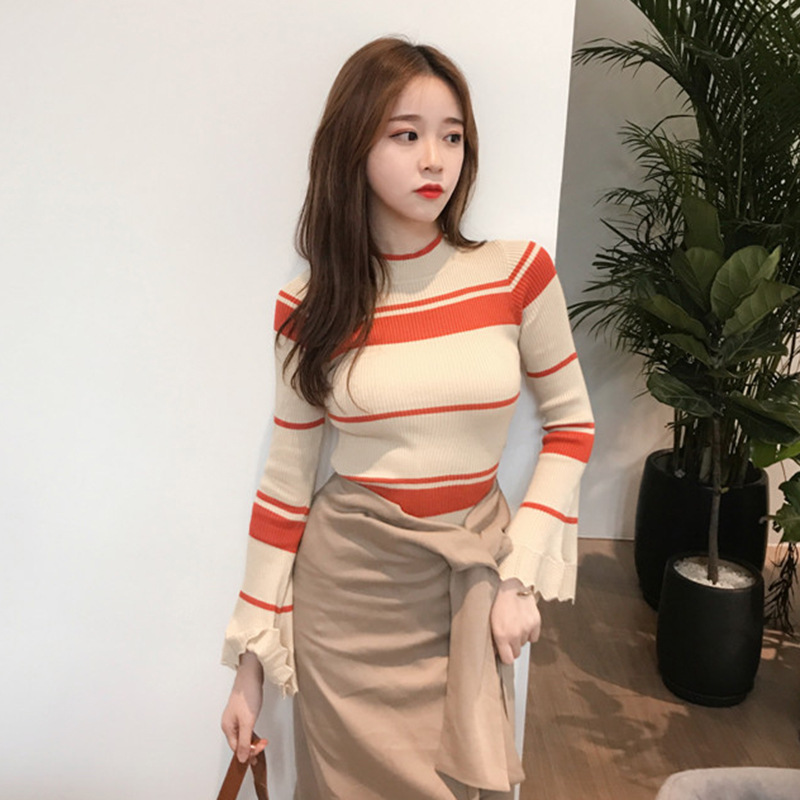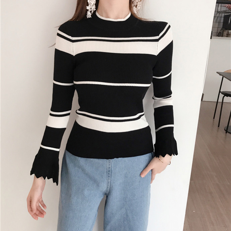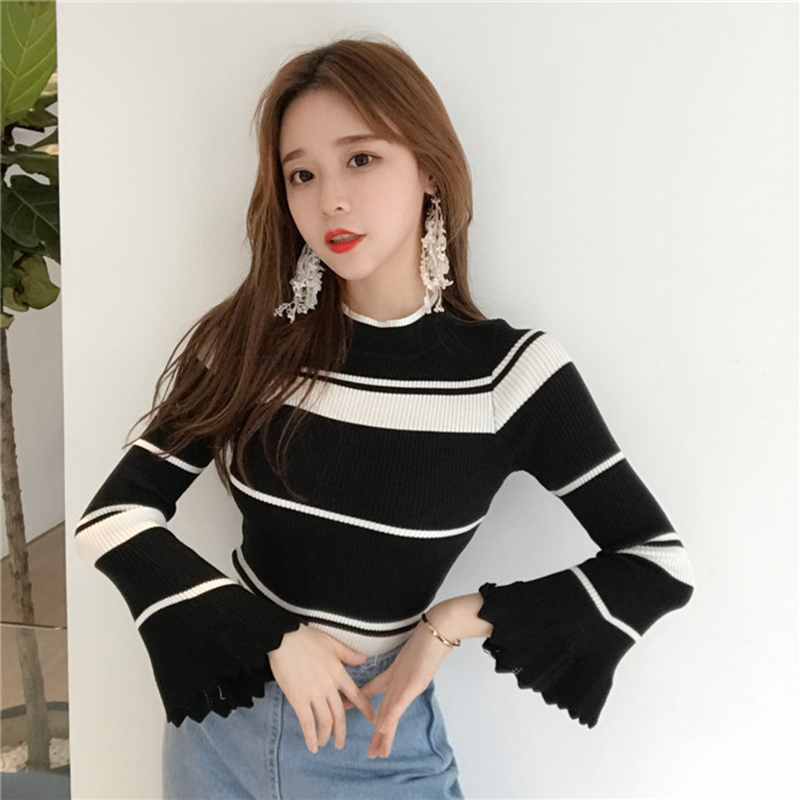 秋冬女裝2018新款韓版修身條紋針織衫學生喇叭袖顯瘦半高領毛衣女