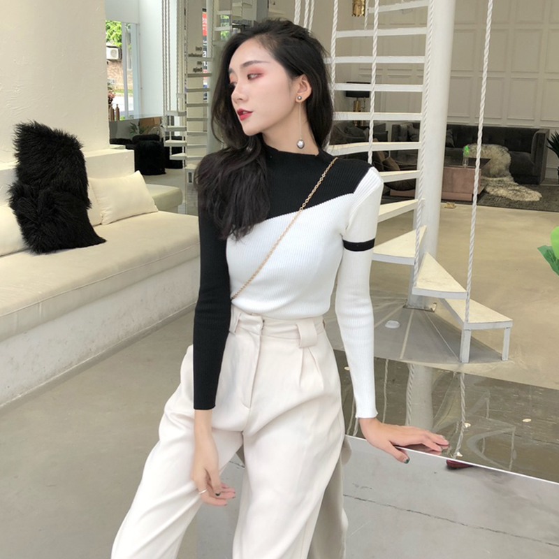 / 港風針織衫毛衣女秋裝2018新款修身條紋拼色半高領長袖打底上衣潮